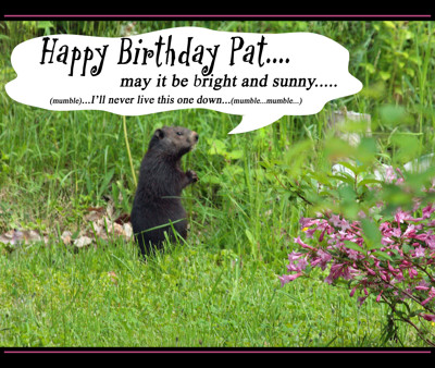 I figured I'd jump on the birthday bandwagon and wish Pat/Icedancer/Skates a Happy Birthday. This is actually a groundhog, but the title "groundhog greetings" don't exactly roll off the tongue quite so well. This critter and it's mate decided to dig a den on a wooded bank of the side lawn and raise a family. They pay their rent by doing some light weeding duties and public service announcements when necessary. So far they've stayed out of the flower beds. Haven't seen any of the young yet. The last time they were here they got evicted by a mother skunk; hopefully things will go better this time around. Enjoy.