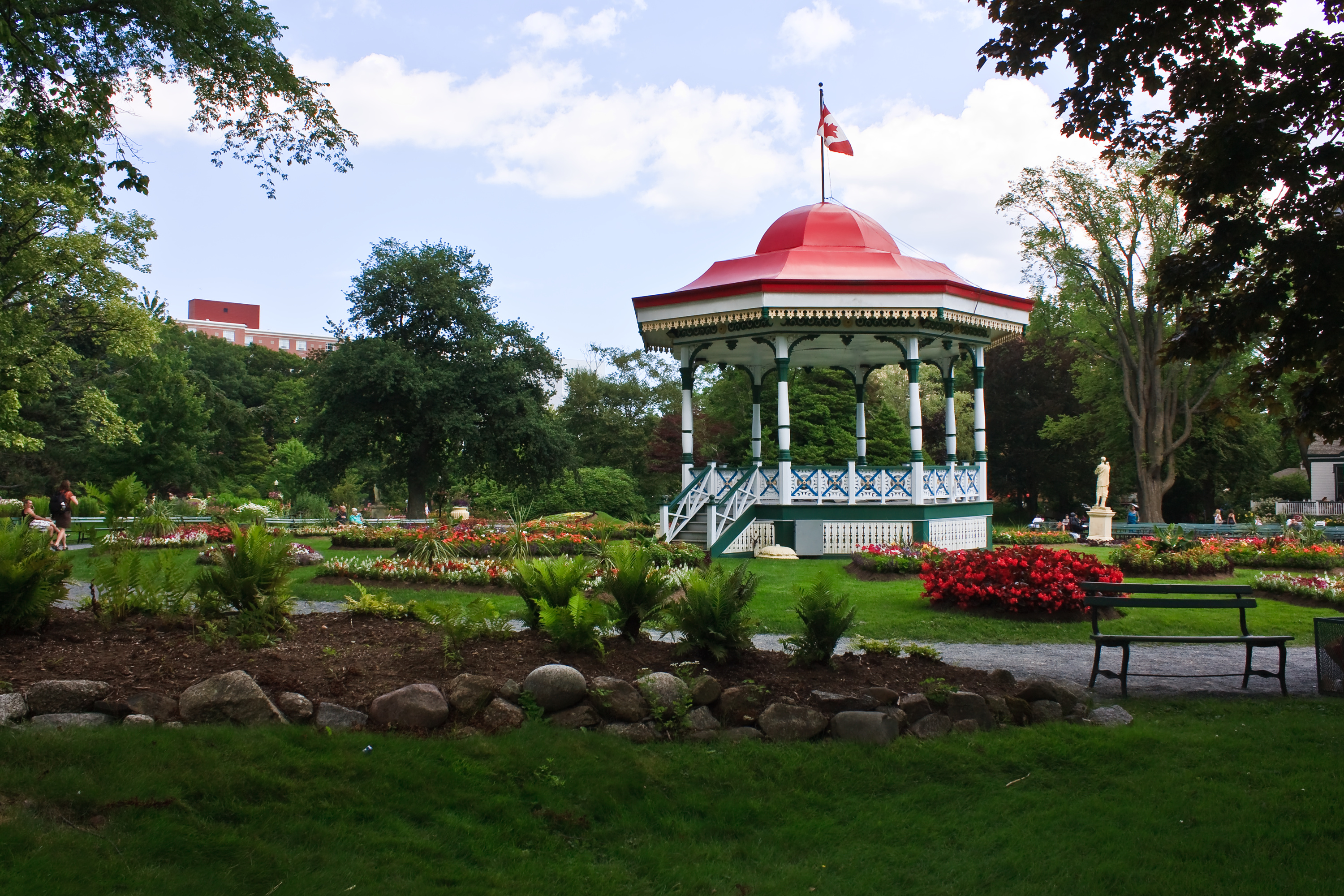 This is the gazebo located in the Halifax Public Gardens and a bit of its surrounding flower gardens and greenery. I'm told the gazebo also doubles as a bandstand, so maybe later if you are all well behaved I'll shatter some eardrums and croak out a few tunes. Anybody play the electric spoons by chance? There are benches galore in the back should you be inclined to want a seat. So no need to crowd onto the one in the foreground. Besides, for some silly reason it's facing the wrong way. There's really not much of a view looking this way, unless you like looking at trees and random strangers snapping pictures. A rather rude statue is turning its back to us. I think the pigeons were off mugging some small chap in a more secluded area of the gardens.