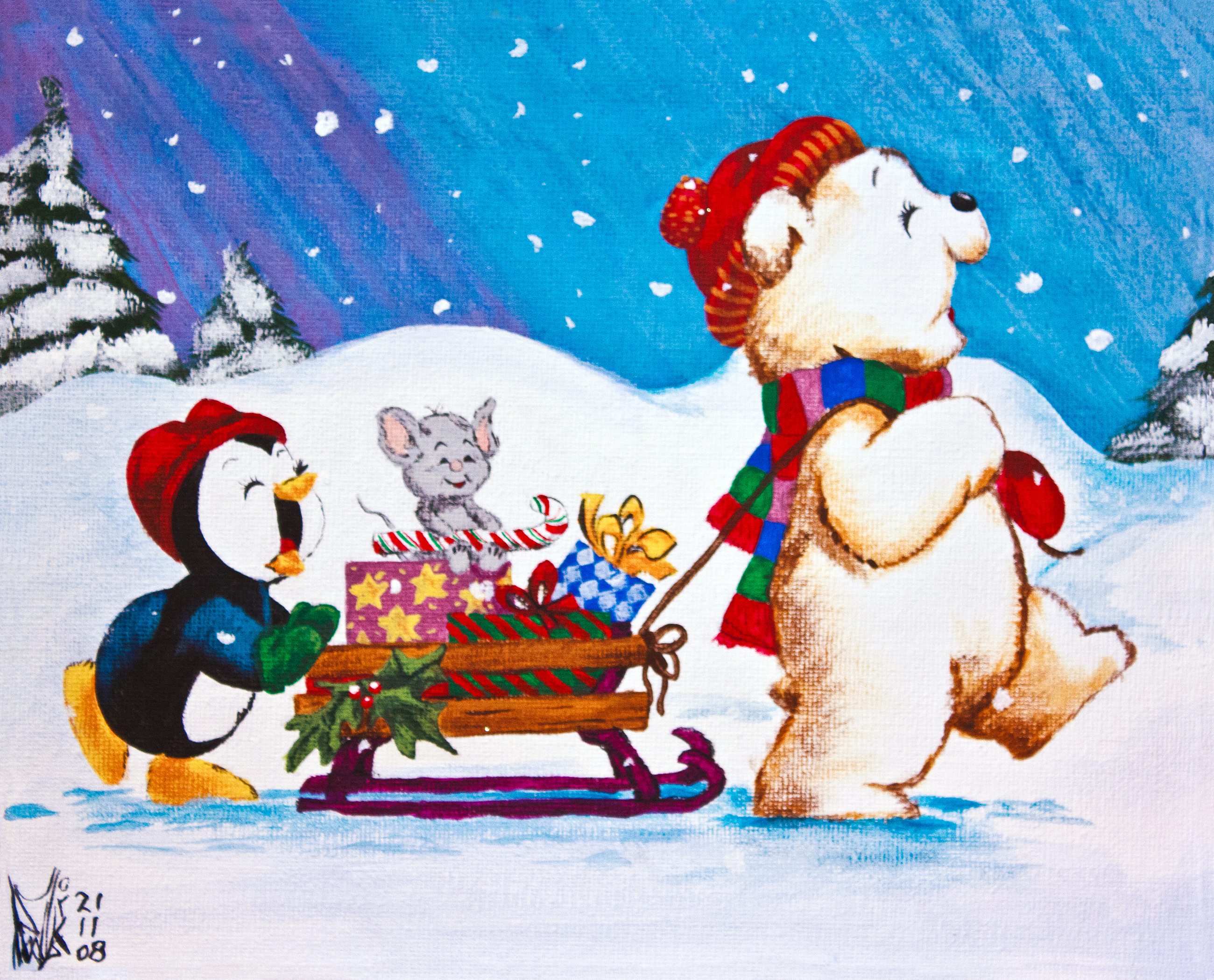 The bear seems to have lost a mitten. If you see it please turn it in at the front desk. A reward of a candy cane is offered. Sorry to disappoint all the cats out there, but I've been informed that the mouse is not a stocking stuffer. Though it does not exclude her from stuffing stockings, after all there is much work to be done before the night is over. It would seem the three of them could well be singing this tune as they make their way through the night to delivery their special packages.