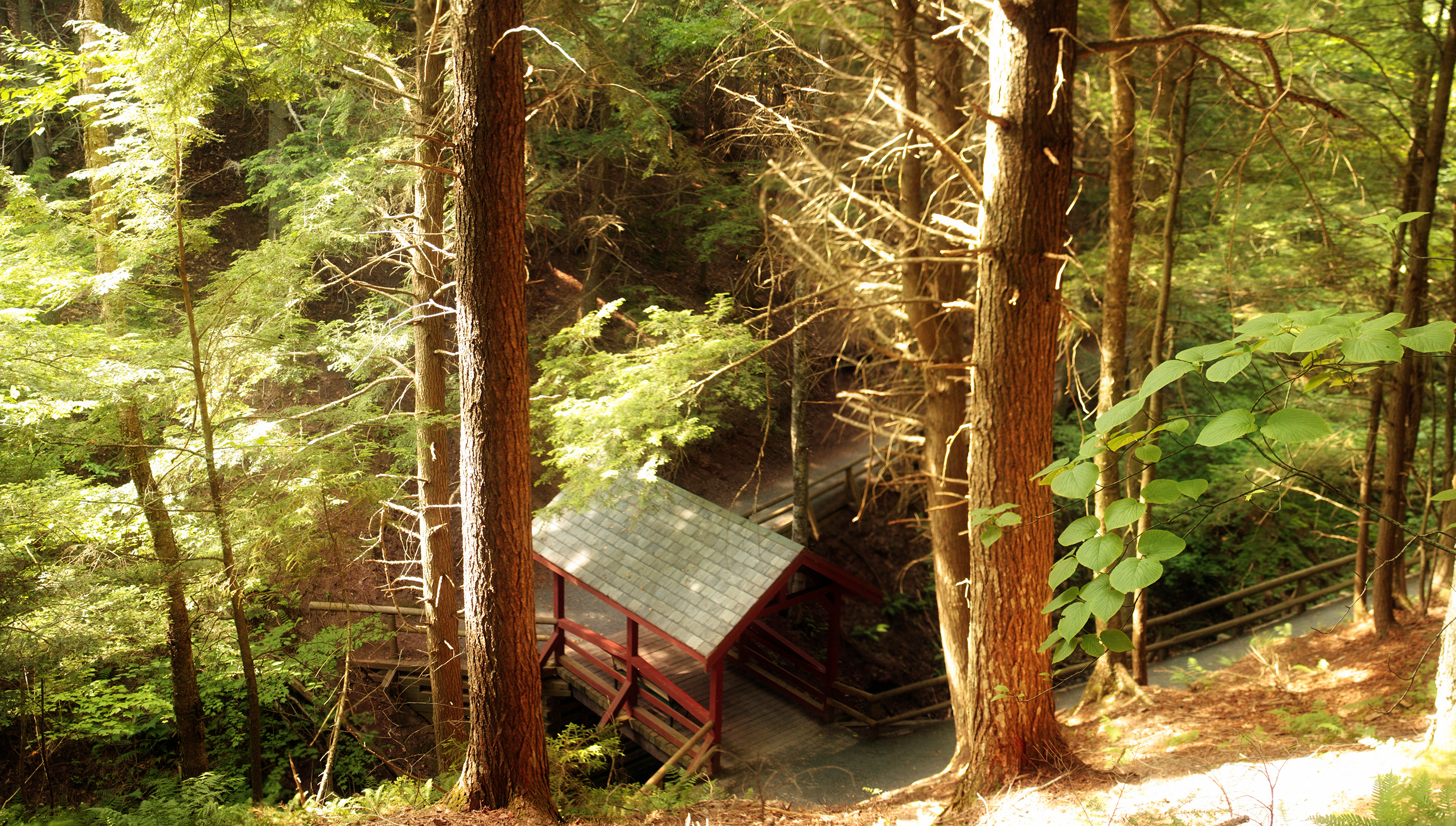 A view of one of the parks many trails as seen from a vantage point slightly off the beaten path. This small bridge sits up the trail a little ways from the bench seen in the previous post. The roof offers some protection from the gangs of squirrels that roam the park harassing innocent hikers. But, it is still a long mad dash to the relative safety of the parking lot and your car. So you better have strong legs.