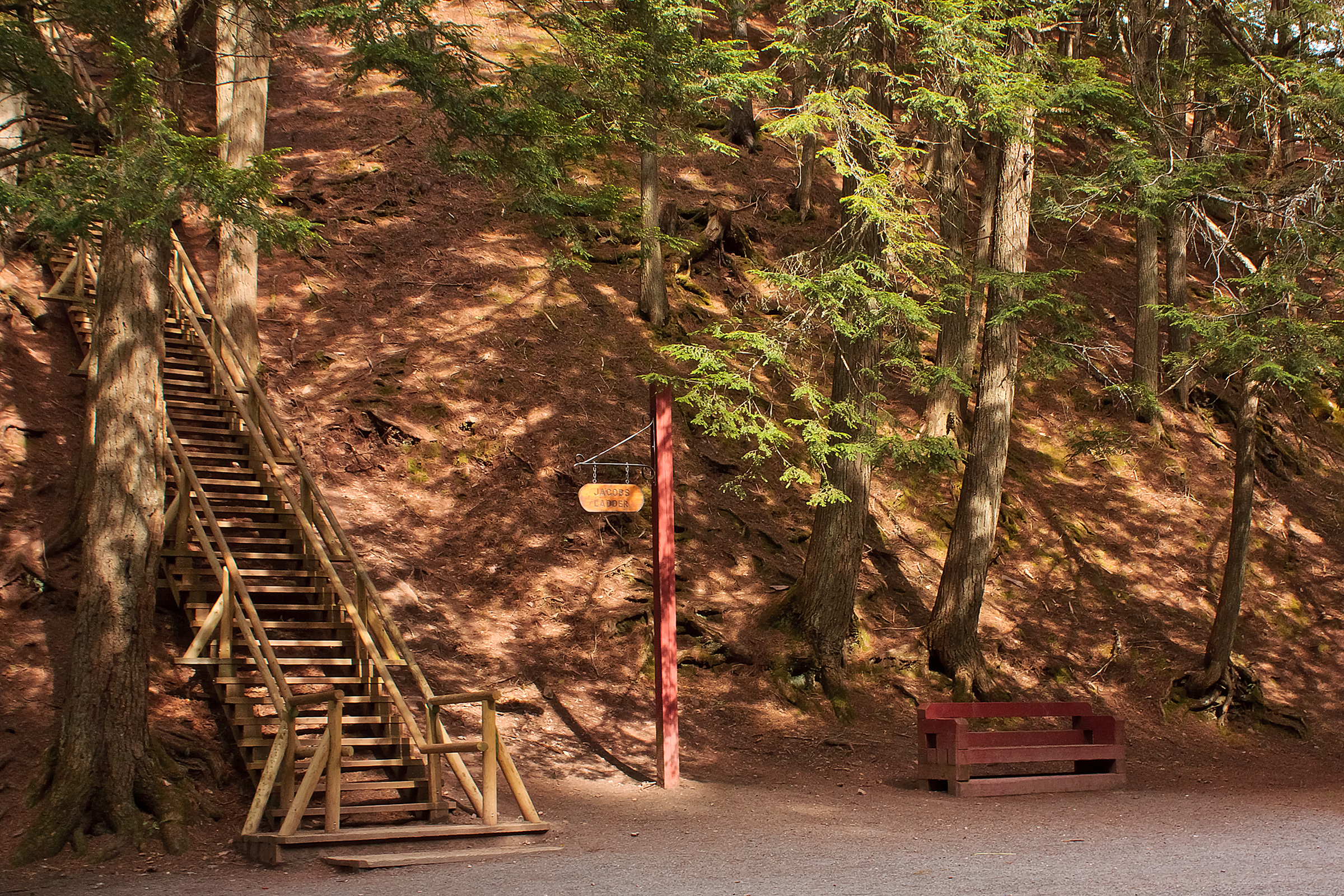 If you're in for a bit of exercise feel free to climb the stairs. There's only about a 100 or so of them to reach the top. I keep loosing count as I climb them as I'm too interested in trying to catch my breath. When you reach the top you can ride the bannister down to the bottom and repeat the process as desired. On the other hand you can opt out and sit on the bench and watch the world go by at a leisurely pace.