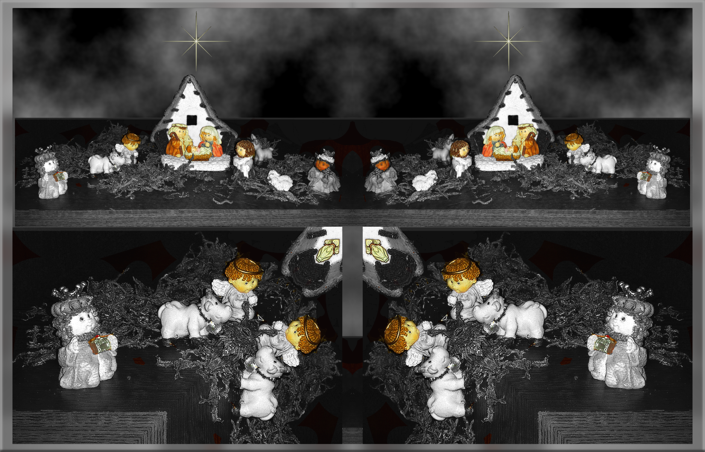 "Christ The Savior Is Born". Something I might just squeak in there for the contest but if not, enjoy just the same:) You have to look real hard but there are sheep there:) A shot of a model Nativity scene at our place that measures about 16" left to right represented here in the top panel. Thanks for your comments:)