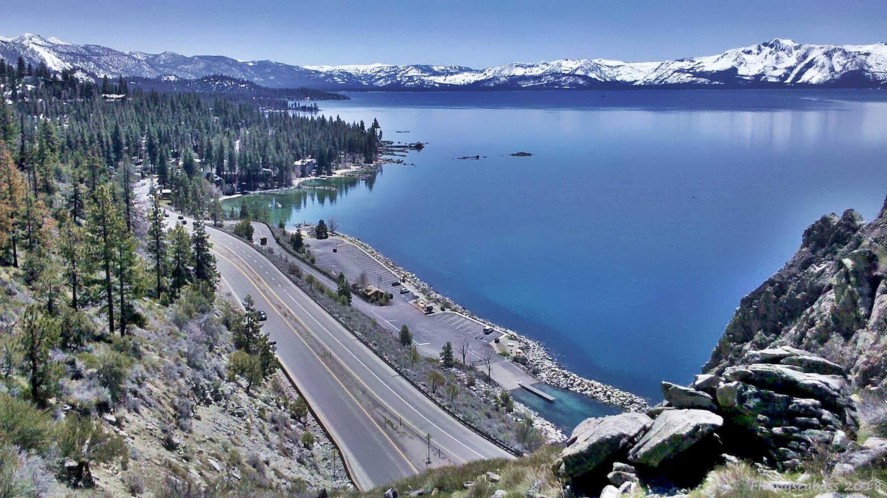 This is on highway 50 (Lincoln Highway) on the east side of Lake Tahoe. It's known as Cave Rock. Many may know where this is or have been there themselves and know how great a view it is.Taken from this location a few years ago with my cell phone: US-50, Glenbrook, NV 89413 Here: 39.046349, -119.948309). Enjoy if you can:):)