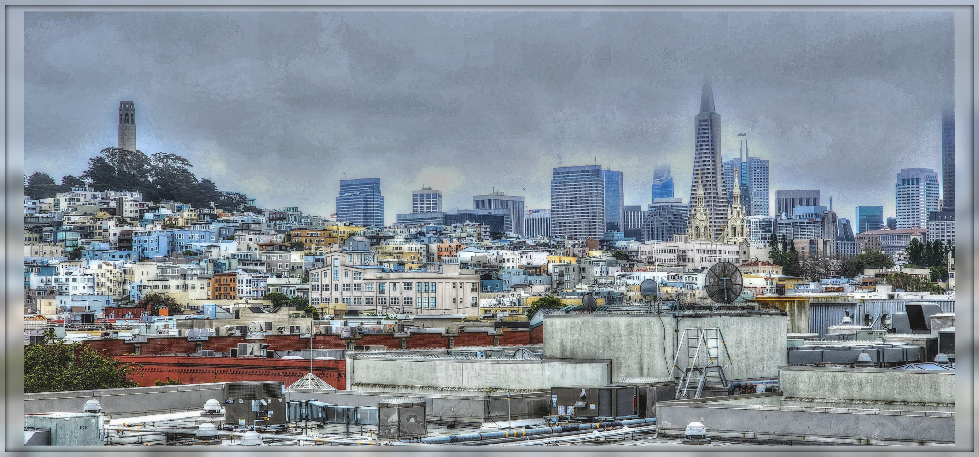 Here is a look across a portion of San Francisco towards the Transamerica Pyramid and Coit Tower in SF, Ca. using Photomatix Pro 7 for the HDR effect. Thanks for your comments:) Some experimenting on my part:):)