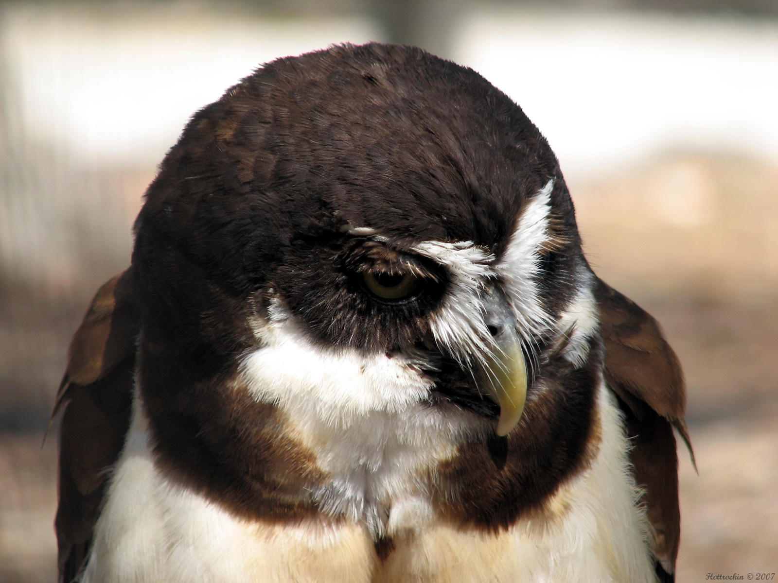 Spectacled Owl Family Strigidae, Pulsatrix perspicillata The spectacled owl lives in the rainforests of Central and South America. They acquired the nickname "crab owl" because of their habit of catching and eating crabs on riverbanks. The young may take as long as five years to reach adult plumage (head changes from white to black.) They stand 1.5 feet tall and have a 3 foot wingspan.