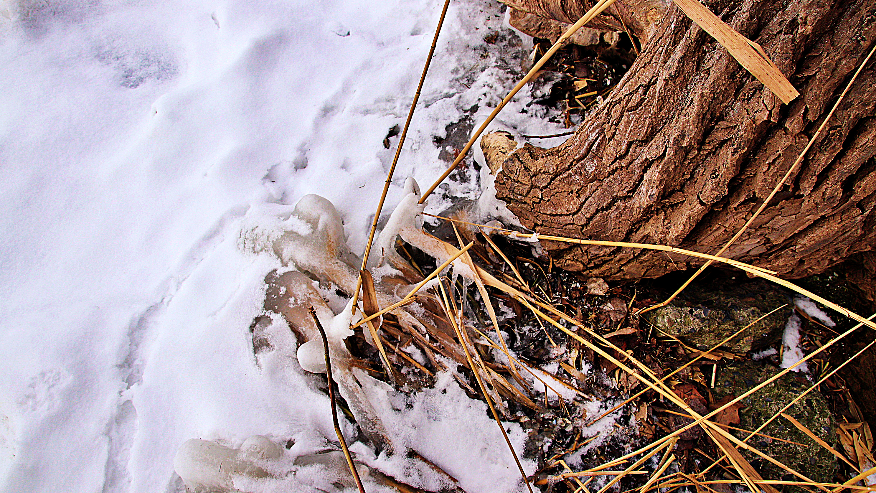 Blown over Foxtails are frozen in place near the edge of the lake.