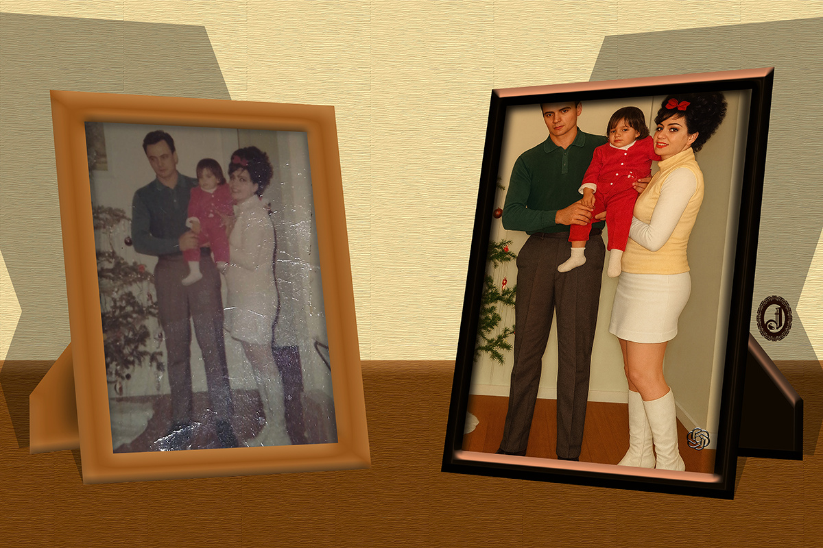 --- (Right side) - NOT at all satisfied! Although there's much more clarity, the images really don't look like what's in the original, AND the AI actually "chopped off" the top of both the adults' heads! I don't know what the AI was thinking about (Since when does AI think?) when it did that, but I am not pleased!
