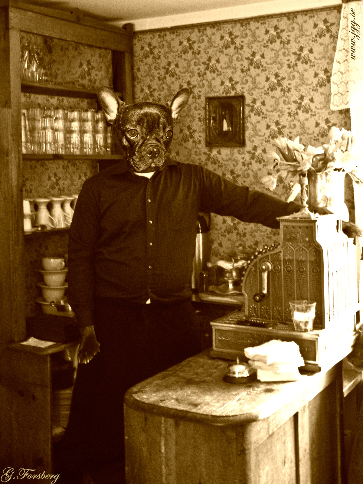 Mix between human and French bulldog. I thought the sepia-look fitted this image. I took the photo at an old style café in the old quarter at Skansen in Stockholm. http://www.skansen.se I have been visiting my family during the easter and took the photo of the French bulldog on the train going there. Hope you like it and thanks for watching :-)