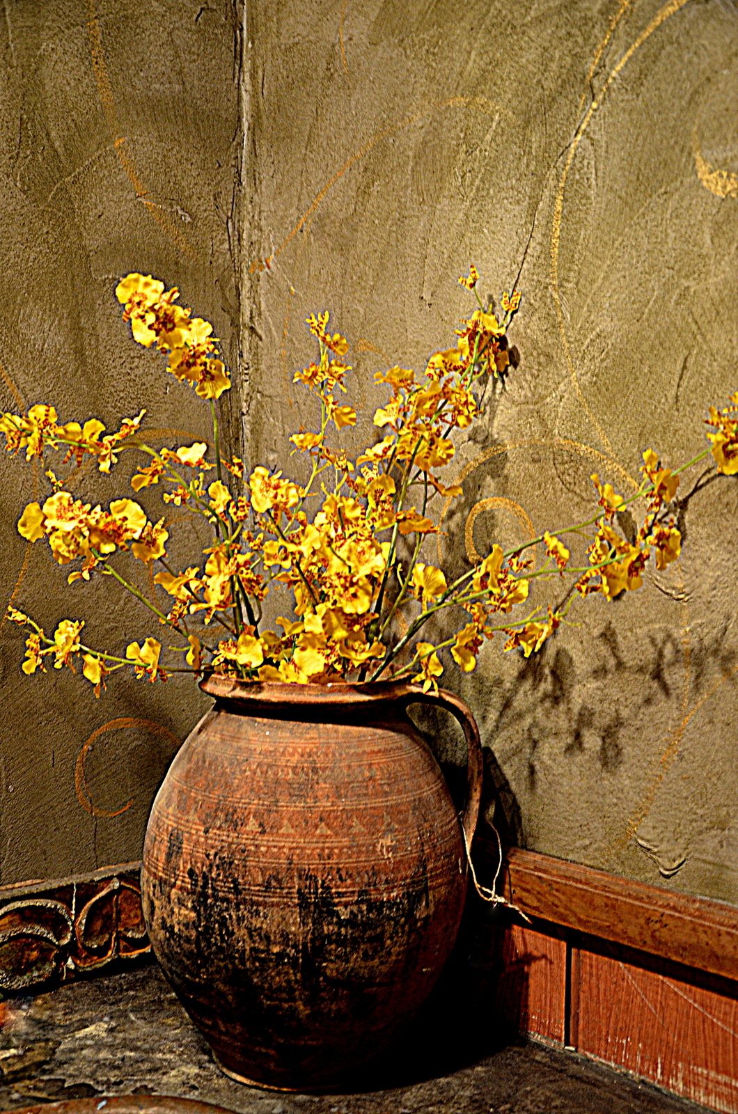 We've all heard that one should never be without their camera. I found this to be true as I entered a public restroom and this beautiful vase , flowers and textured wall caught my eye . Some may look at you a little odd .... but hey you'll get the shot .
