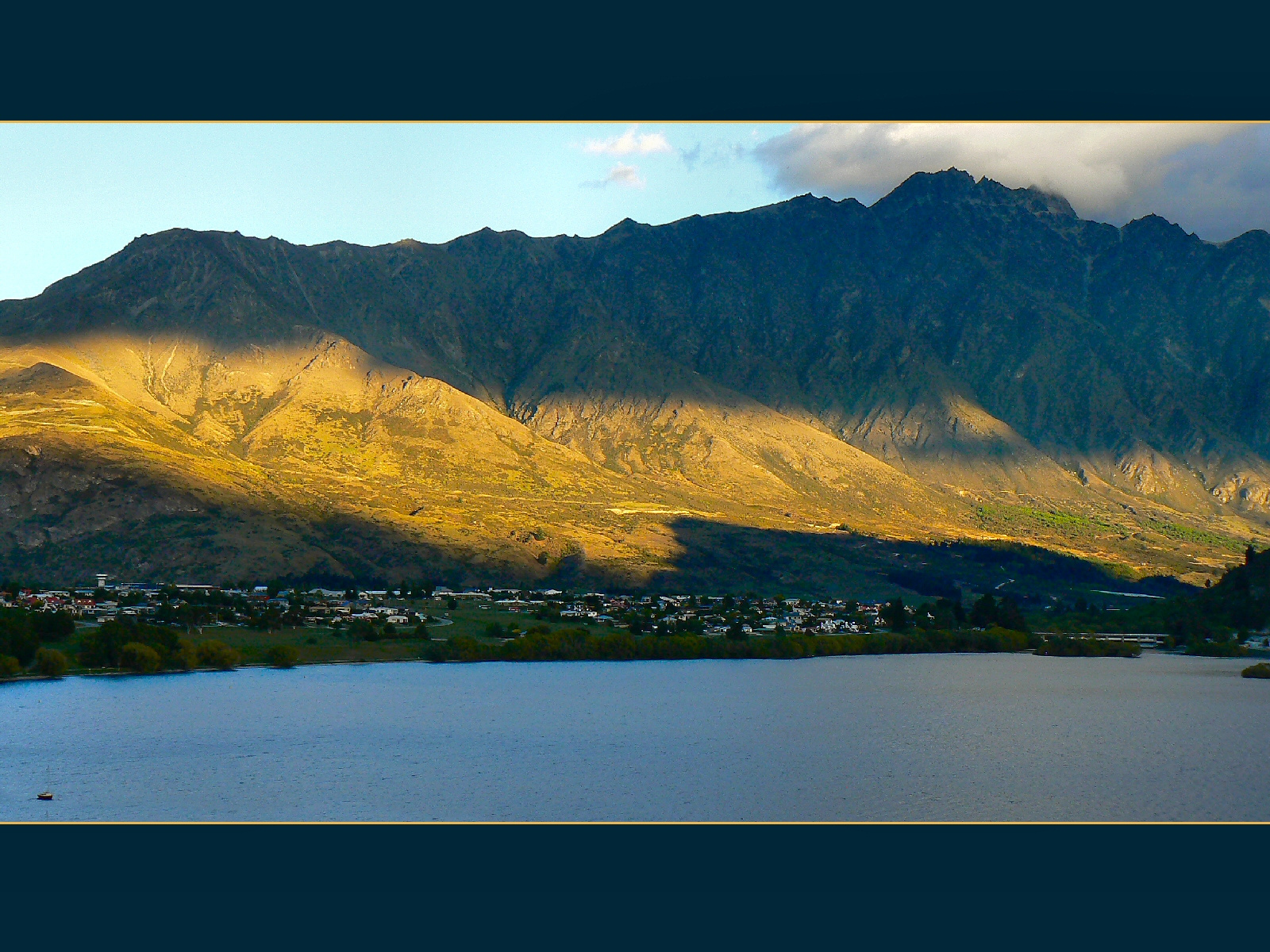 Early evening sun and shadows on the Remarkables. This was taken with zoom and was the view from the house I stayed in recently.Just sitting on the balcony - good company, a cool drink and my camera - bliss! The mountains look their most beautiful when snow-covered but still have a majesty at this time of the year. "The Remarkables are a mountain range and skifield in Queenstown, South Island, New Zealand. Located on the southeastern shore of Lake Wakatipu, the range lives up to its name by rising sharply to create an impressive backdrop for the waters. High points in the range include Double Cone (2340 metres) and Ben Nevis (2330 metres). The mountains were allegedly named The Remarkables because they are one of only two mountain ranges in the world which run directly north to south.