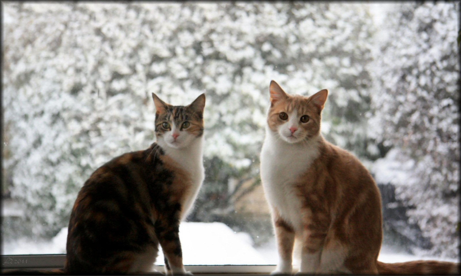 Cats sitting on the window sill pleading . . . "Pleeease let us outside again. You know how we love to play in the snow,then to climb up a tree and from there on to the roof for a better view, and forget how to get down again. And you KNOW you don't mind climbing a ladder in subzero temperatures to help us down when you hear our pathetic cries. Of course we would not get cold - we have our fur coats on!"