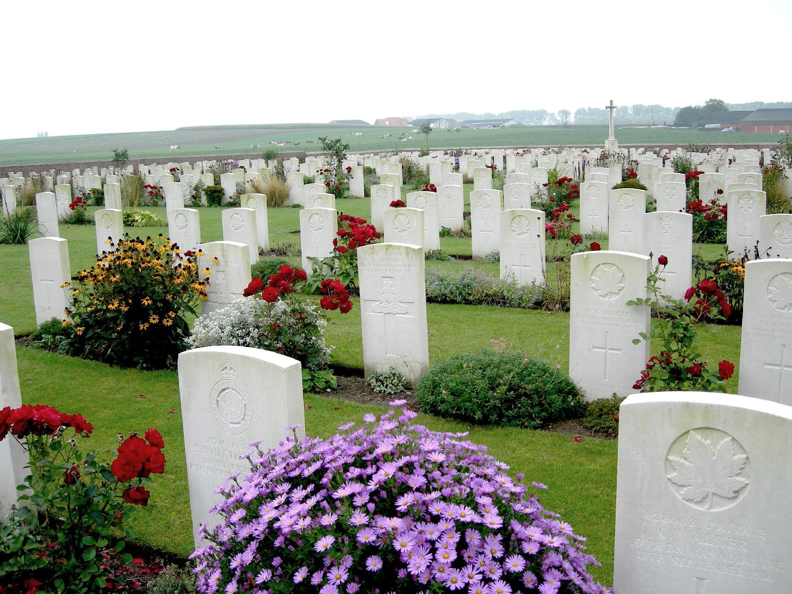 Ridge Wood Military Cemetery.(Worldwar 1 - 1914-18) This is only one of the 173 Commonwealth cemeterys in the wide area of Ieper (Ypres) .West Flanders - Belgium. RIDGE WOOD MILITARY CEMETERY Ridge Wood was the name given to a wood standing on high ground between the Kemmel road and Dickebusch Lake. The cemetery lies in a hollow, on the Western side of the Ridge, and the position was chosen for a "front-line cemetery" as early as May, 1915. The first graves belonged to the 2nd Royal Irish Rifles, and similar groups were made by the 18th, 19th, 20th and 21st Canadian Battalions and the 9th Durham Light Infantry at the times when they occupied this sector. The Battles of the Lys, in the spring of 1918, brought the British front back on to the Ridge, and it was not till July that the Wood was finally cleared by the 6th and 33rd Divisions. There are few burials from these last battles in the cemetery, and the graves of some French Divisions which fought with our own in April and May have been removed. There are now over 600, 1914-18 war casualties commemorated in this site. The cemetery covers an area of 3,729 square metres and enclosed by a brick wall. Burials (Commonwealth War Graves Commission) : United Kingdom : 280 Canada : 292 Australia : 44 New Zealand : 3 Total Commonwealth : 619 Other Nationalities : 2