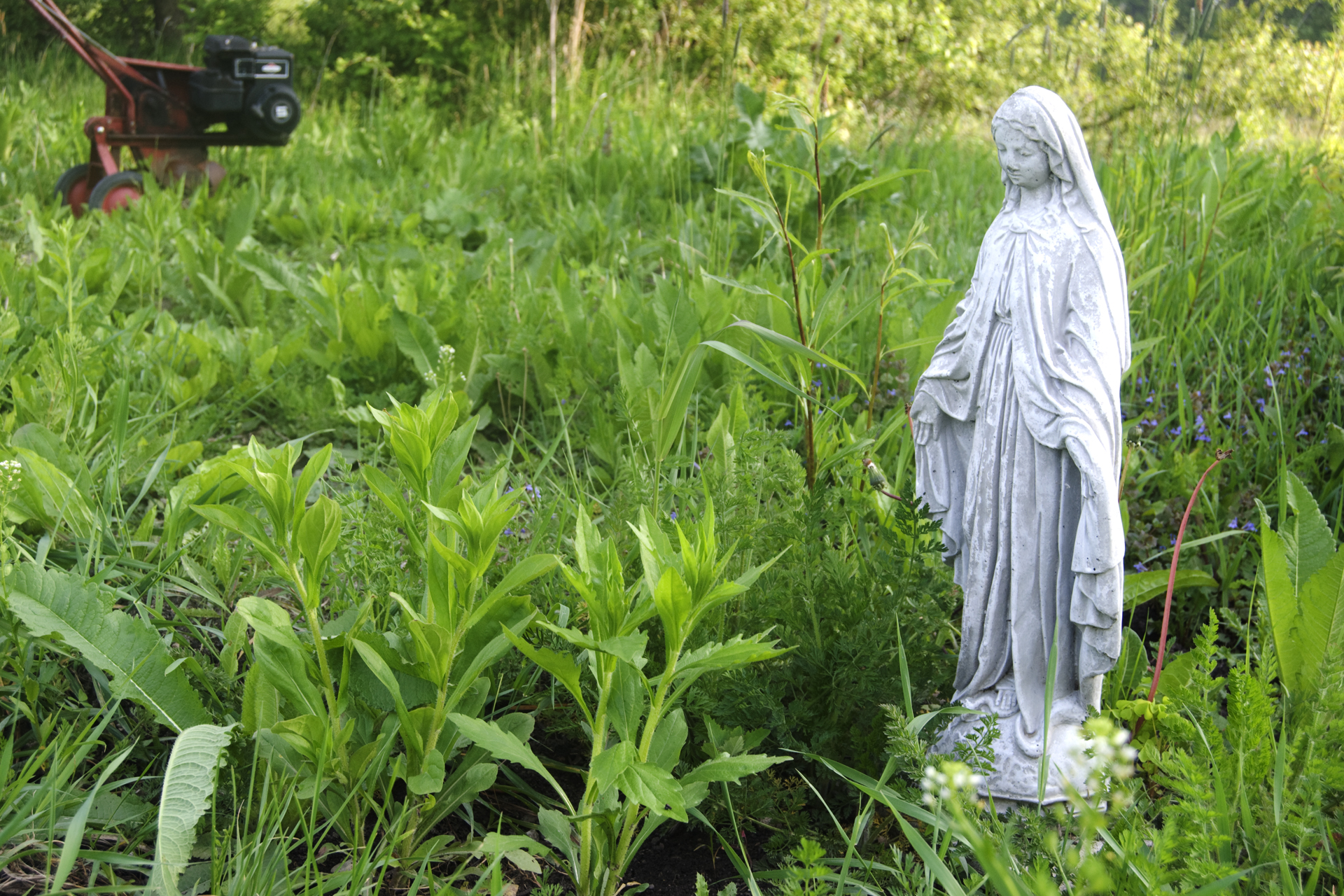 My friend and I visited a forest preserve, and out in an open field we found a bunch of abandoned gardening tools. Apparently someone tried to start a garden there. Of the things we found, one of the most interesting thing was a small statue of the Virgin Mary.