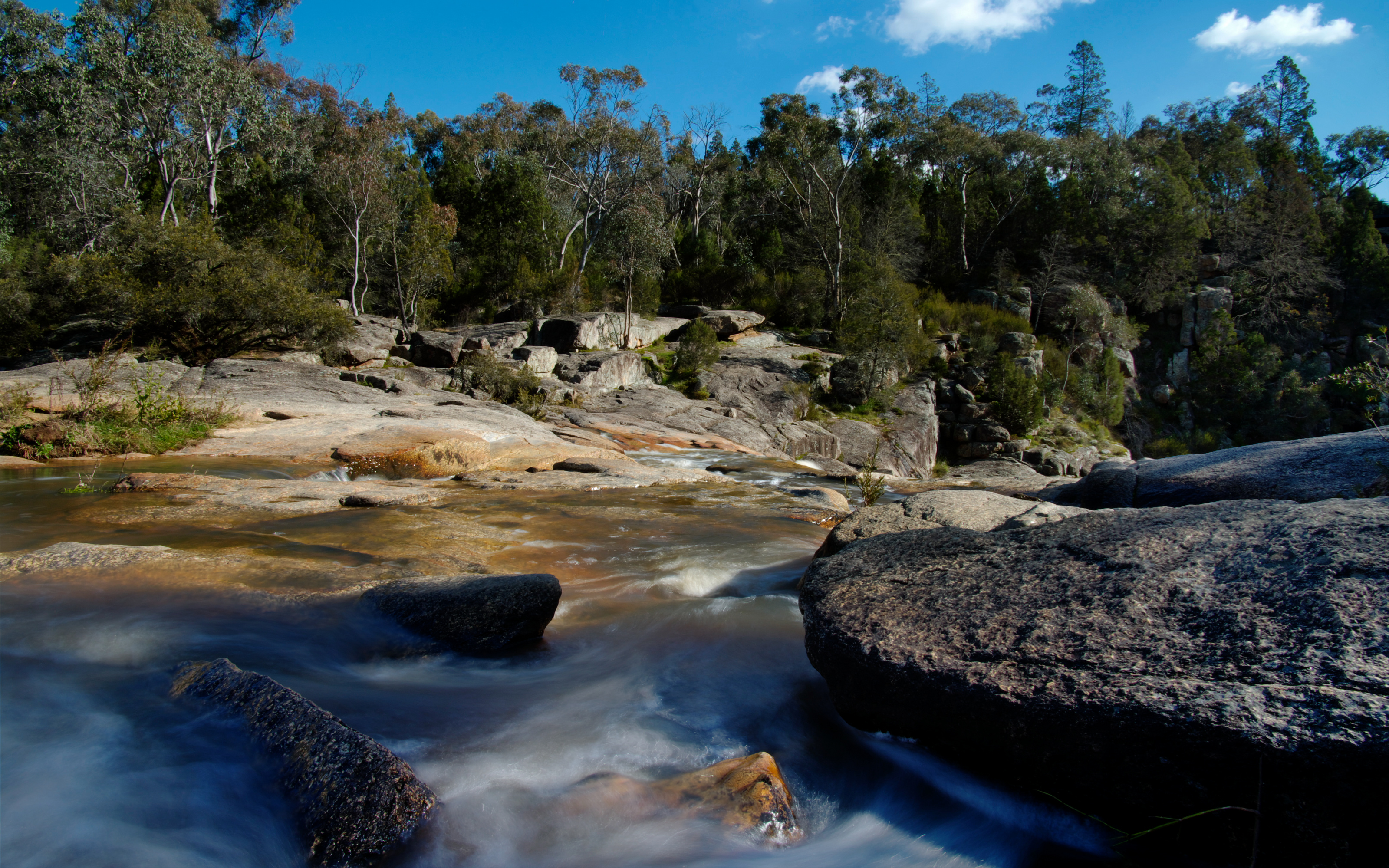 The top of Woolshed Falls, Beechworth, Victoria, before the various cascades above the actual falls. Shadows were starting to creep across the landscape, it was late afternoon.