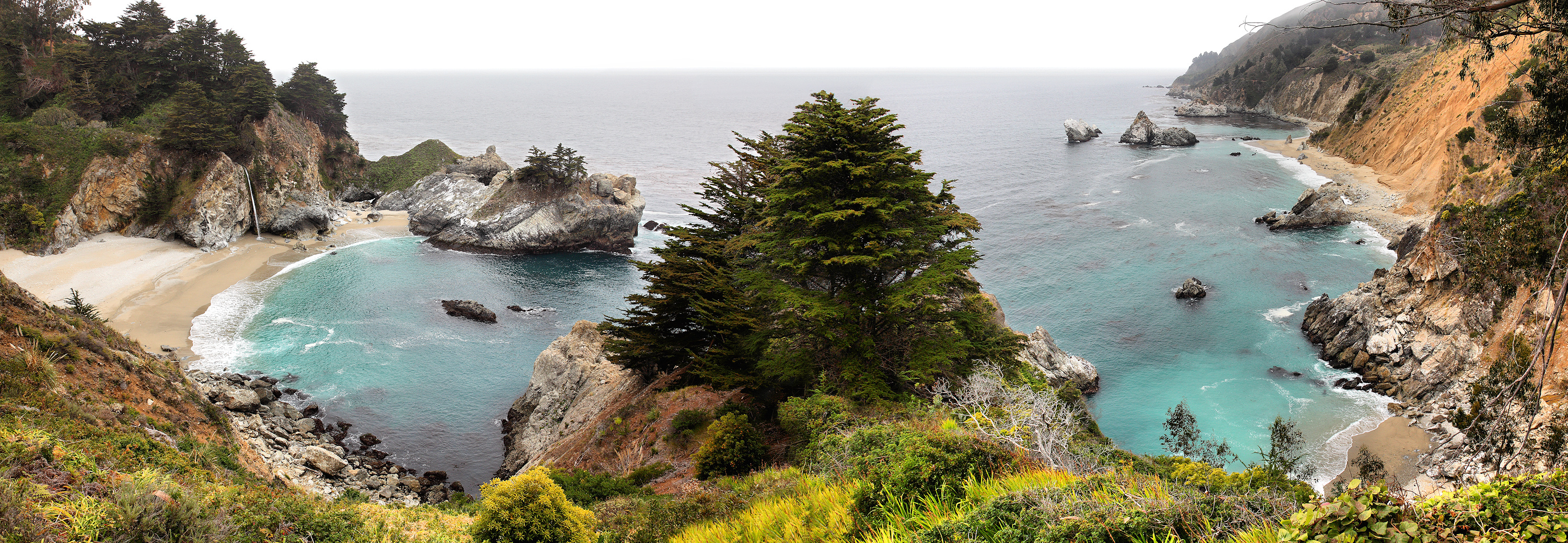 An artists impression of two beautiful views at Julia Pfeiffer Burns State Park. I stitched them into one panorama. Enjoy!
