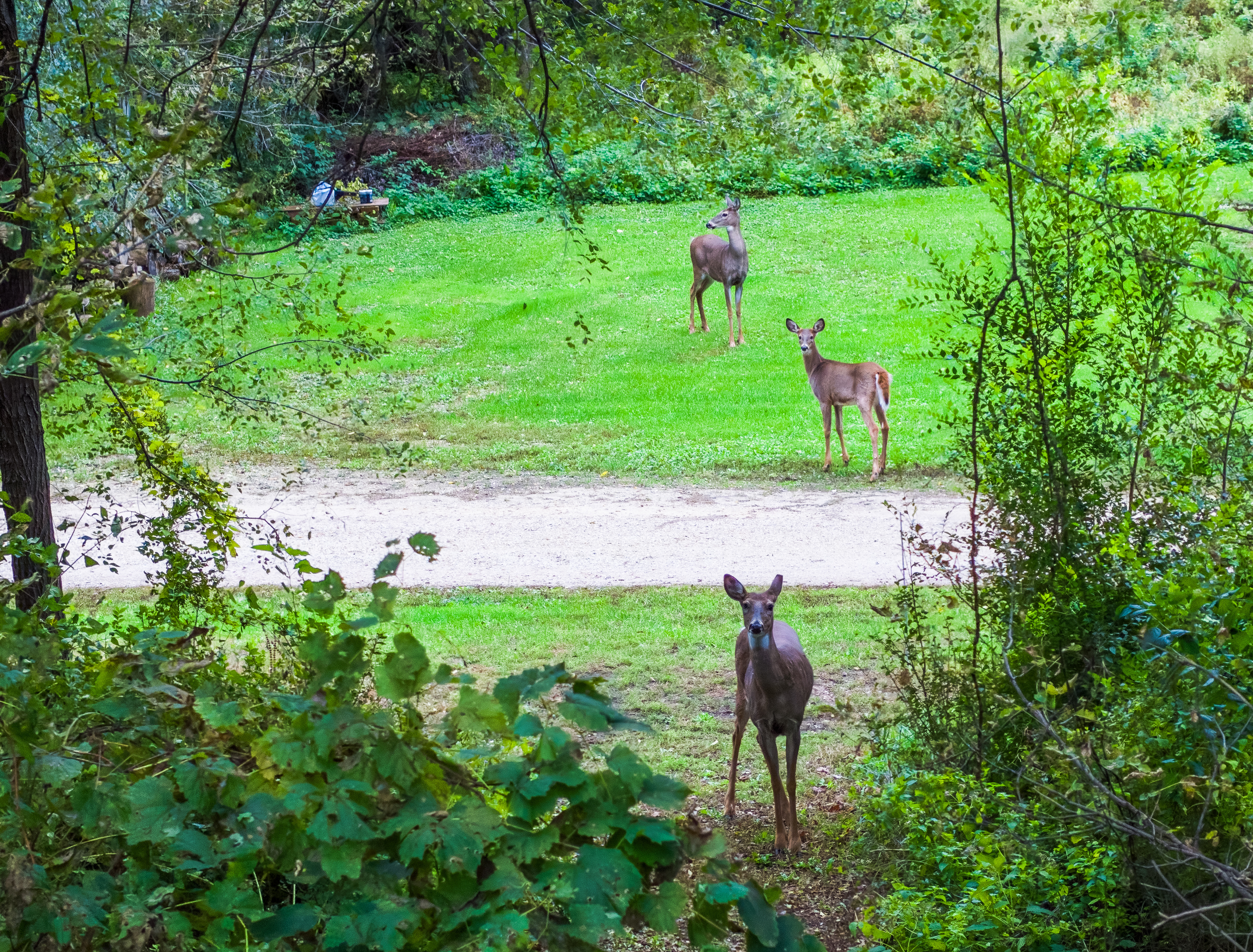 My wife and I were walking a trail and saw a tree off to the side that was quite colorful. I found a side trail to get to the tree, but there were deer on the trail. I thought if we started walking the trail they would run off, but no, momma deer turned and started stamping her feet. Told my wife we would just give up on the tree.