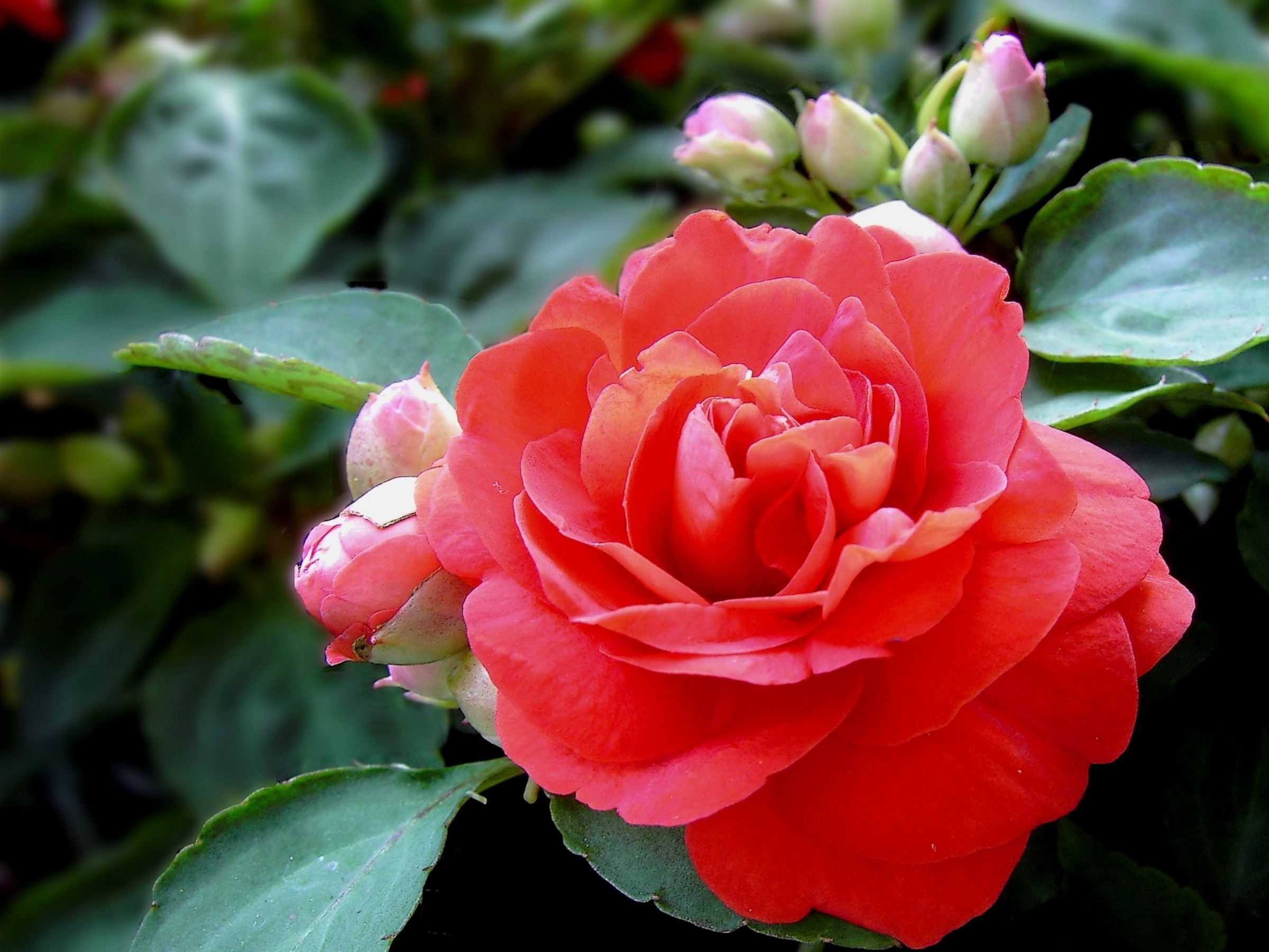 Although this flower looks like a rose it is actually a fuller version of a "Busy Lizzy" (Impatiens walleriana). It is much smaller than a rose.