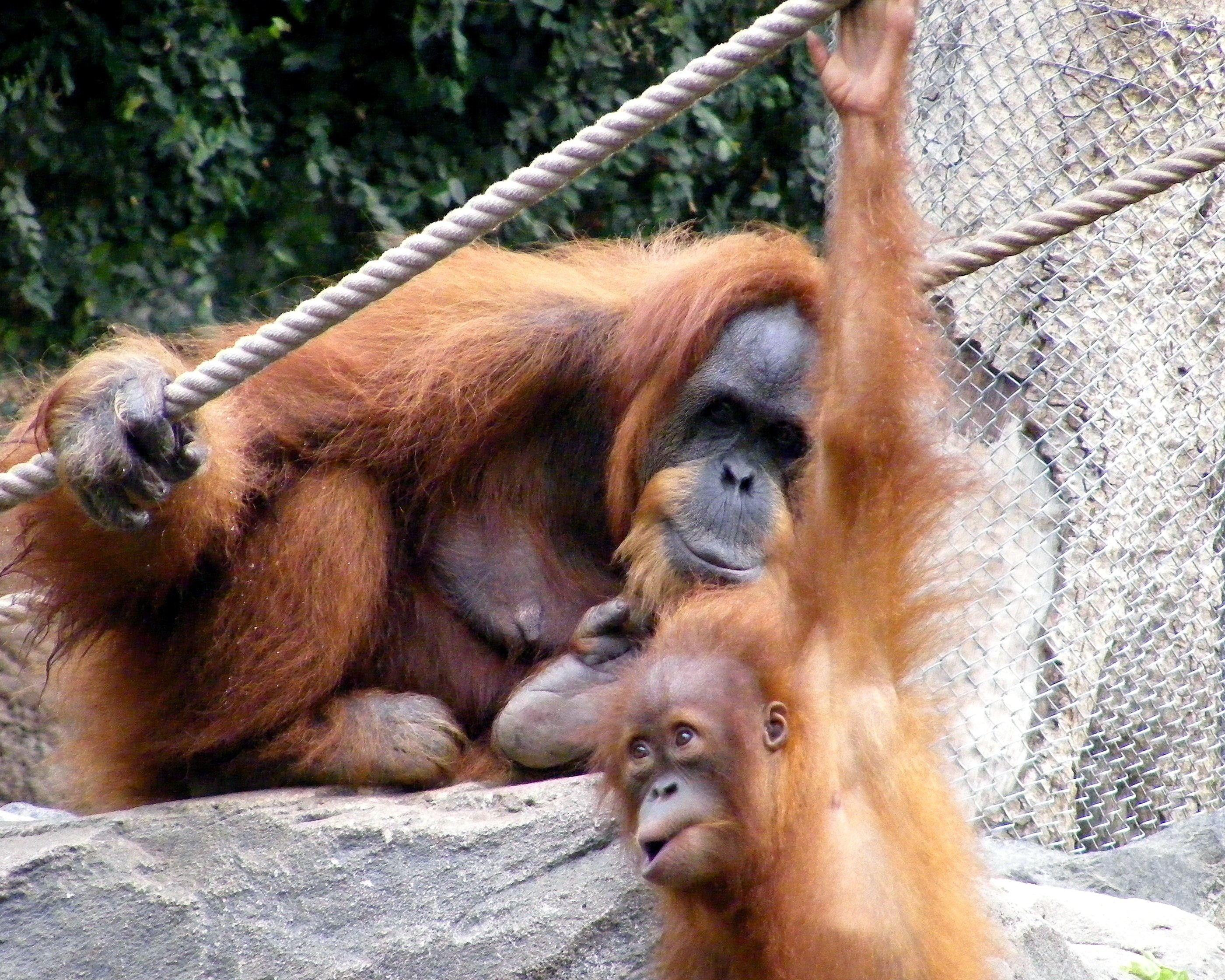 "Look Mum, no hands!" the young fellow seems to say as he lets himself fall and the indulgent mother looks on. Among all creatures on earth Orangutans are closest to humans genetically. See the young fellow's palm - it looks almost human.