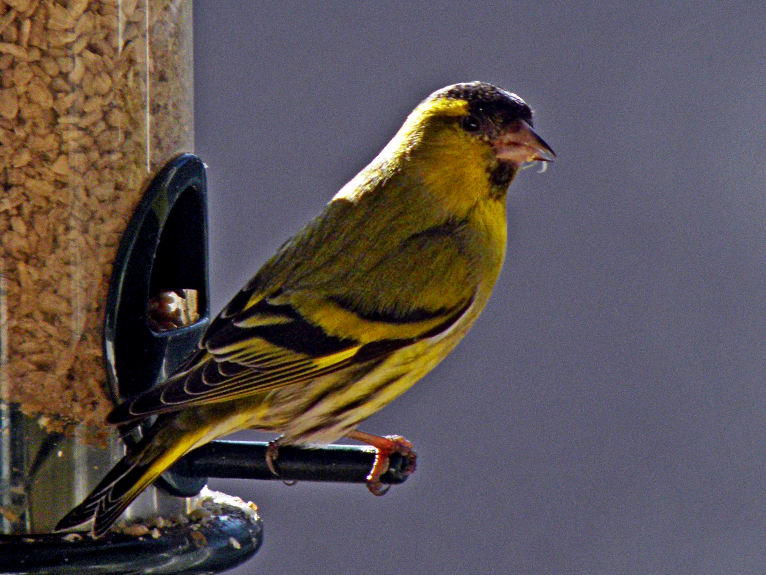 A finch happy with the full feeder. I am surprised how much and how fast they can eat. This photo was taken against the bright light outside.