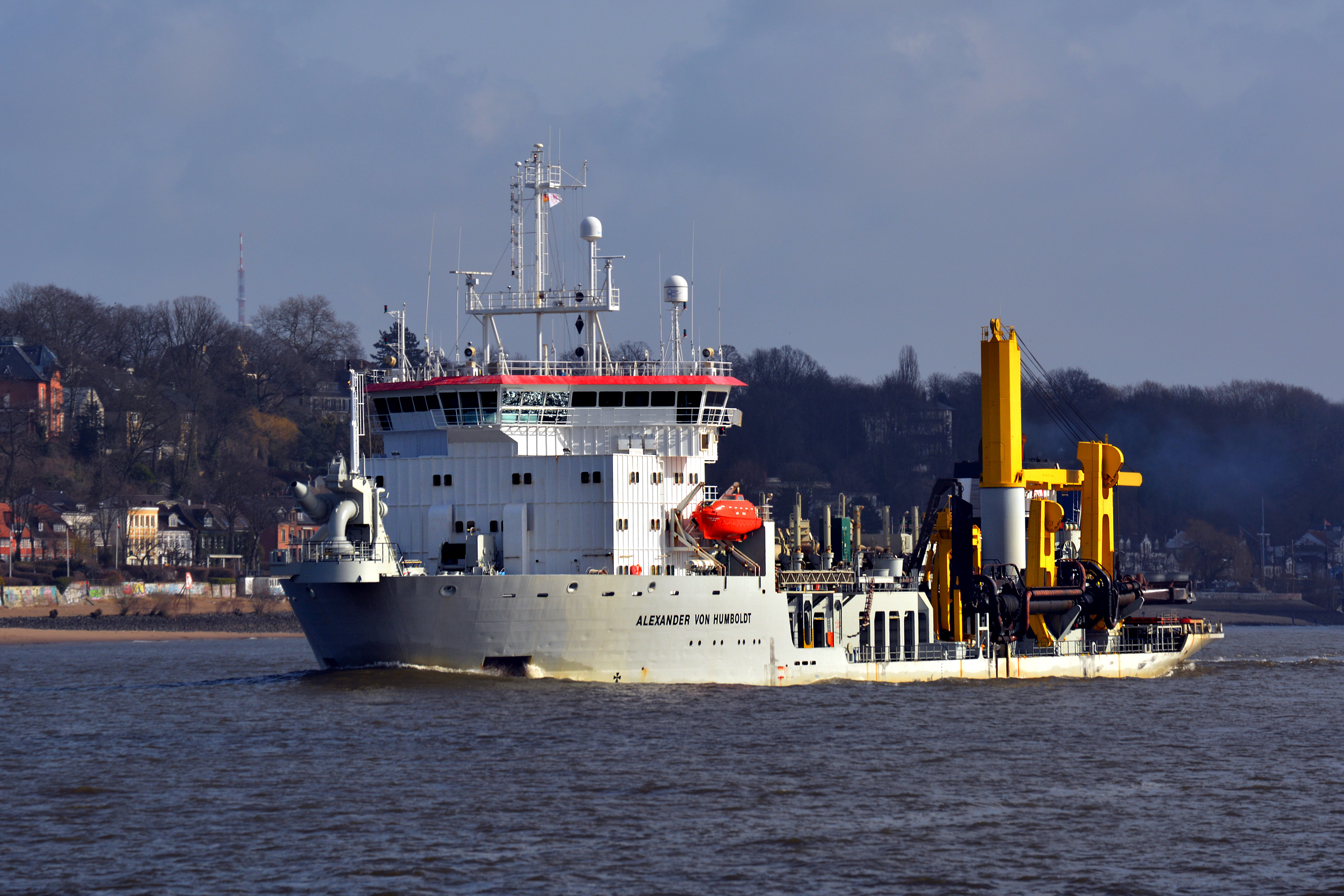 The ship Alexander von Humboldt is a suction dredger. The tidal movements cause sediments of sand and mud to be deposited on the riverbed. These have to be removed regularly to maintain the depth of the channel. On the link you can see how this works.