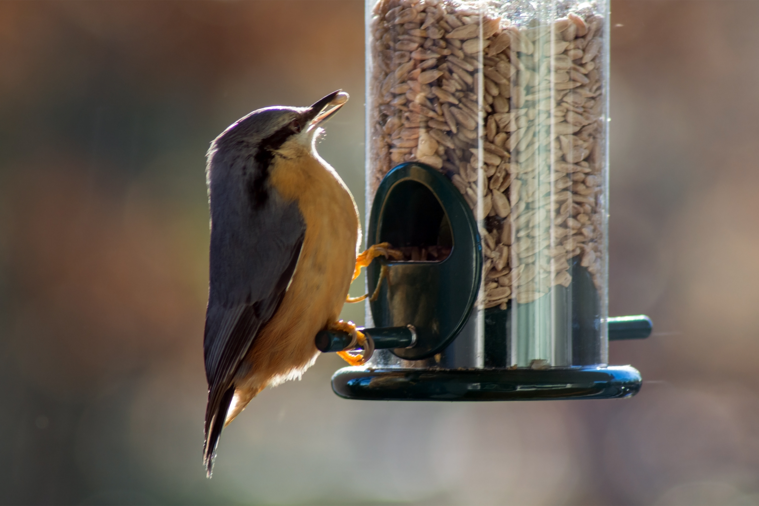 Nuthatch in action - must have been a female because it is smaller and carries the nuts away to store them for the little ones.