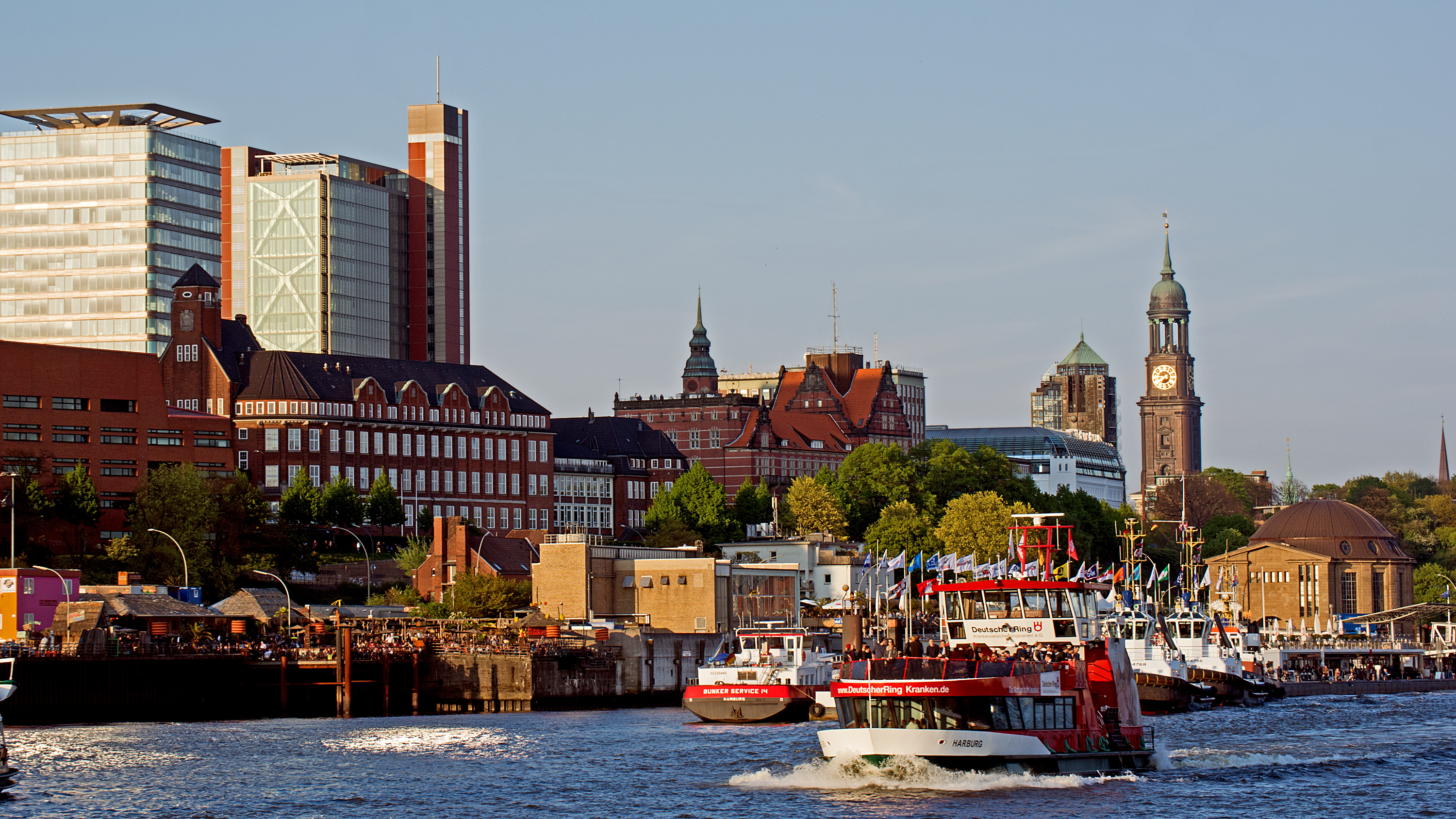 A busy riverside scene in Hamburg. Please view on full screen for details.