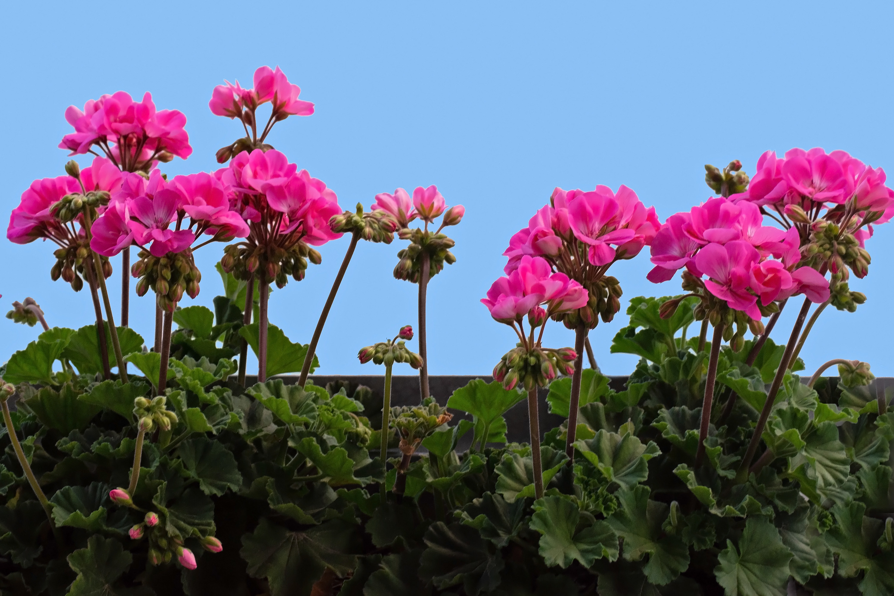 Geraniums on the balcony. They took a long time to bloom because our temperatures were well below the norm.