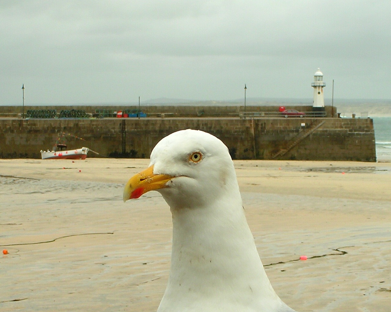 The herring gulls in St Ives wouldn't know a herring if they were hit by one. Pasty gulls and chip gulls now, they feed on our scraps and leftovers, and will steal ice-creams out of unsuspecting holidaymakers' hands. This one was wondering whether my camera was edible.... St Ives 5th May '04