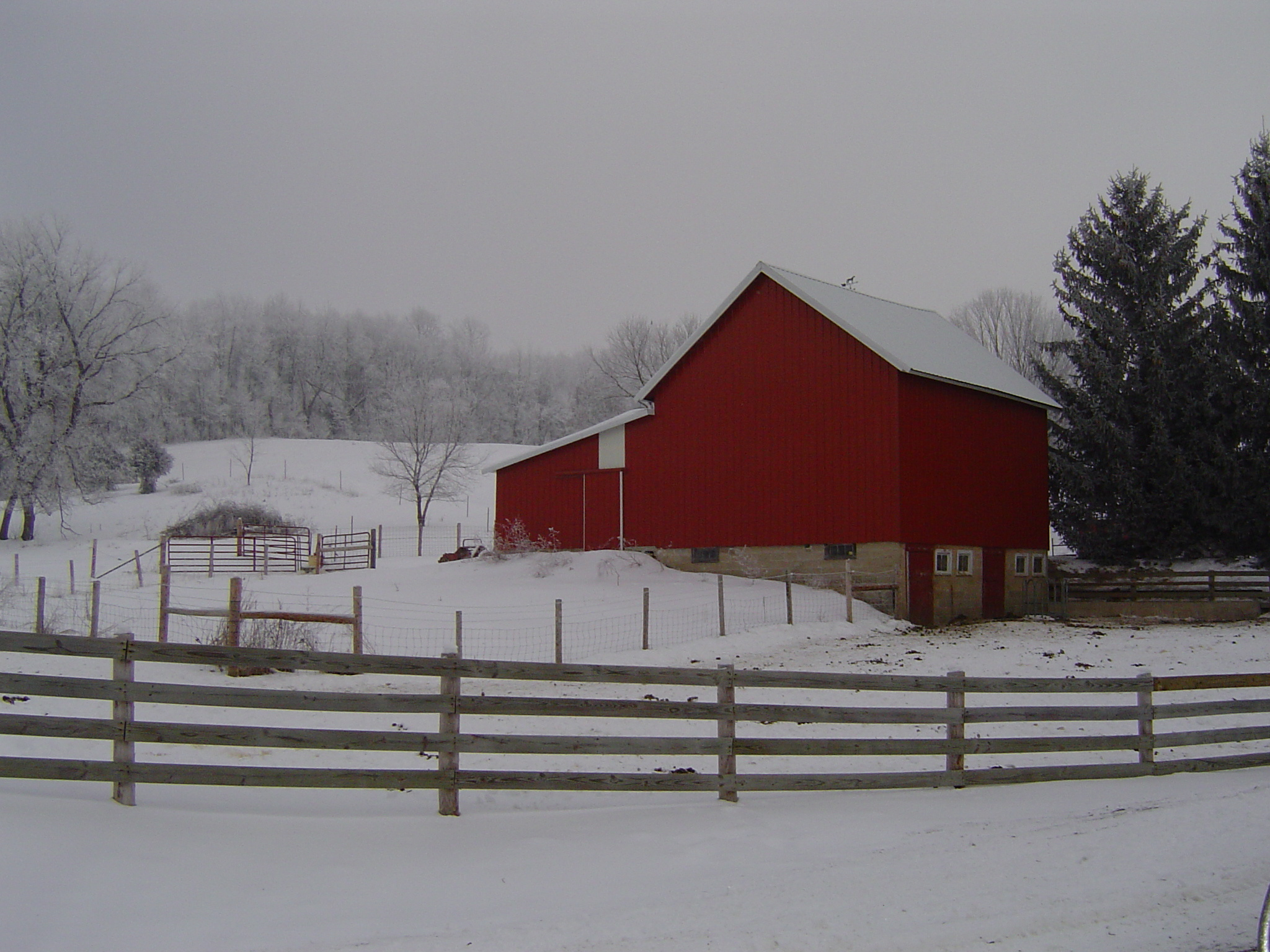 Farmyard on a frosty morning, the red barn really stood out. Reminded me of an old cheer, (Red and White, fight, fight).