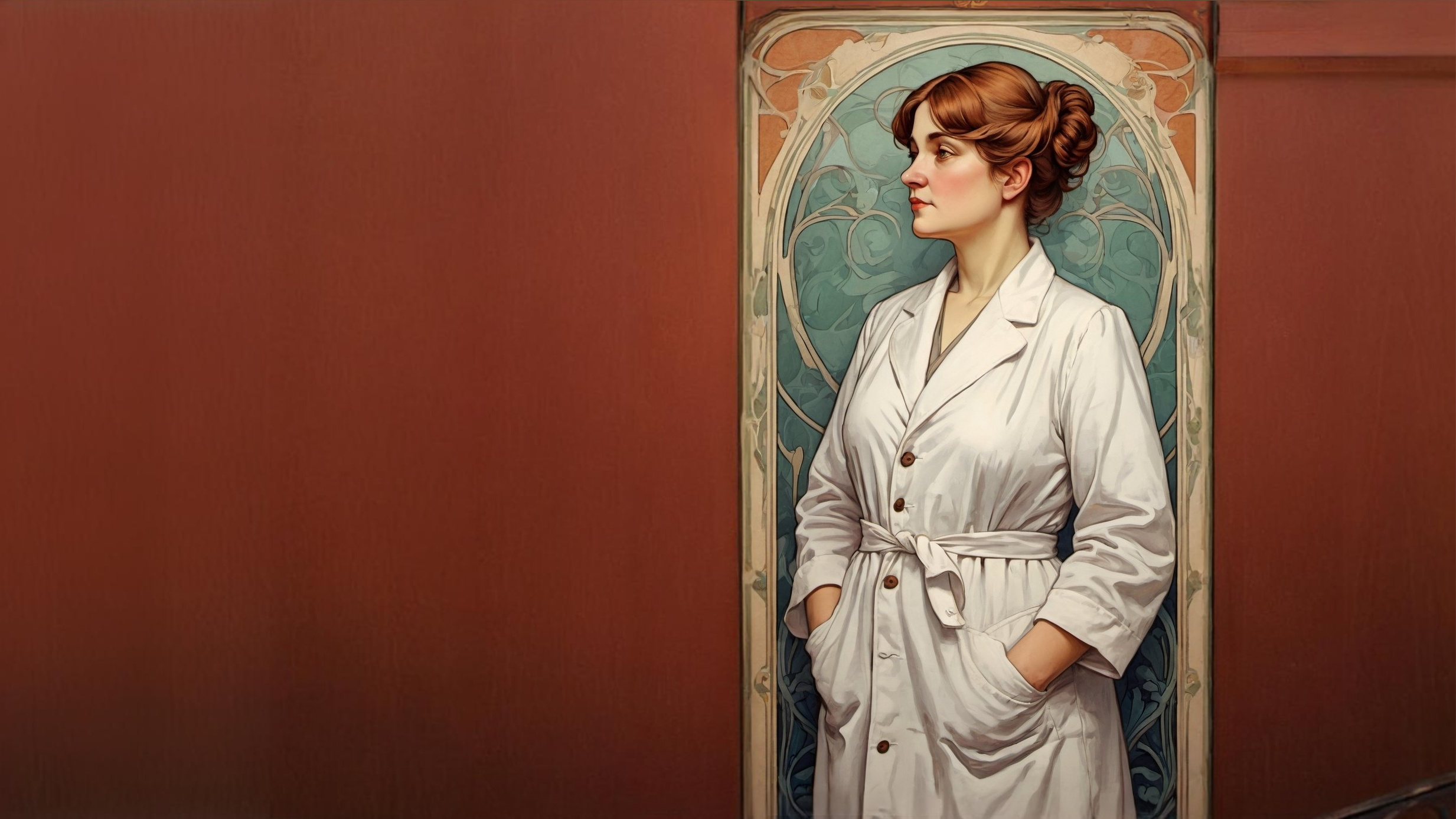 Art Nouveau (New Art) or Jugendstil is an international style in art, architecture and applied arts, especially decorative arts. Laboratory technicians were a favorite subject for artists of the time because of their natural charm and beauty. No one is so beautiful that they do not become even more beautiful with a lab coat on. Brought to life with AI (Stable Diffusion and Firefly).