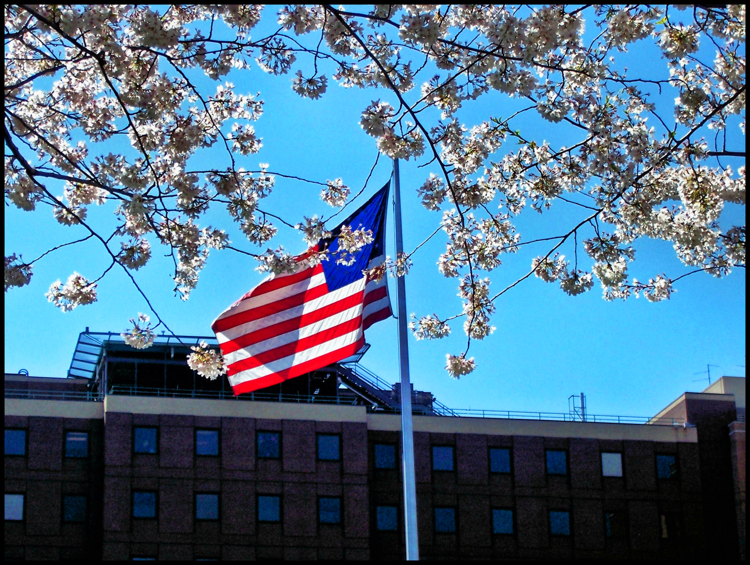 Took this shot on a perfect spring day during my lunch at work. The flag was so beautiful in the sun that day,just a soft breeze to lift it. The heliport is on top of the University of Pittsburgh Medical Center where I work. It was really tough to go back inside that day! PS~could not straighten the horizon without the flagpole tilting~sorry!