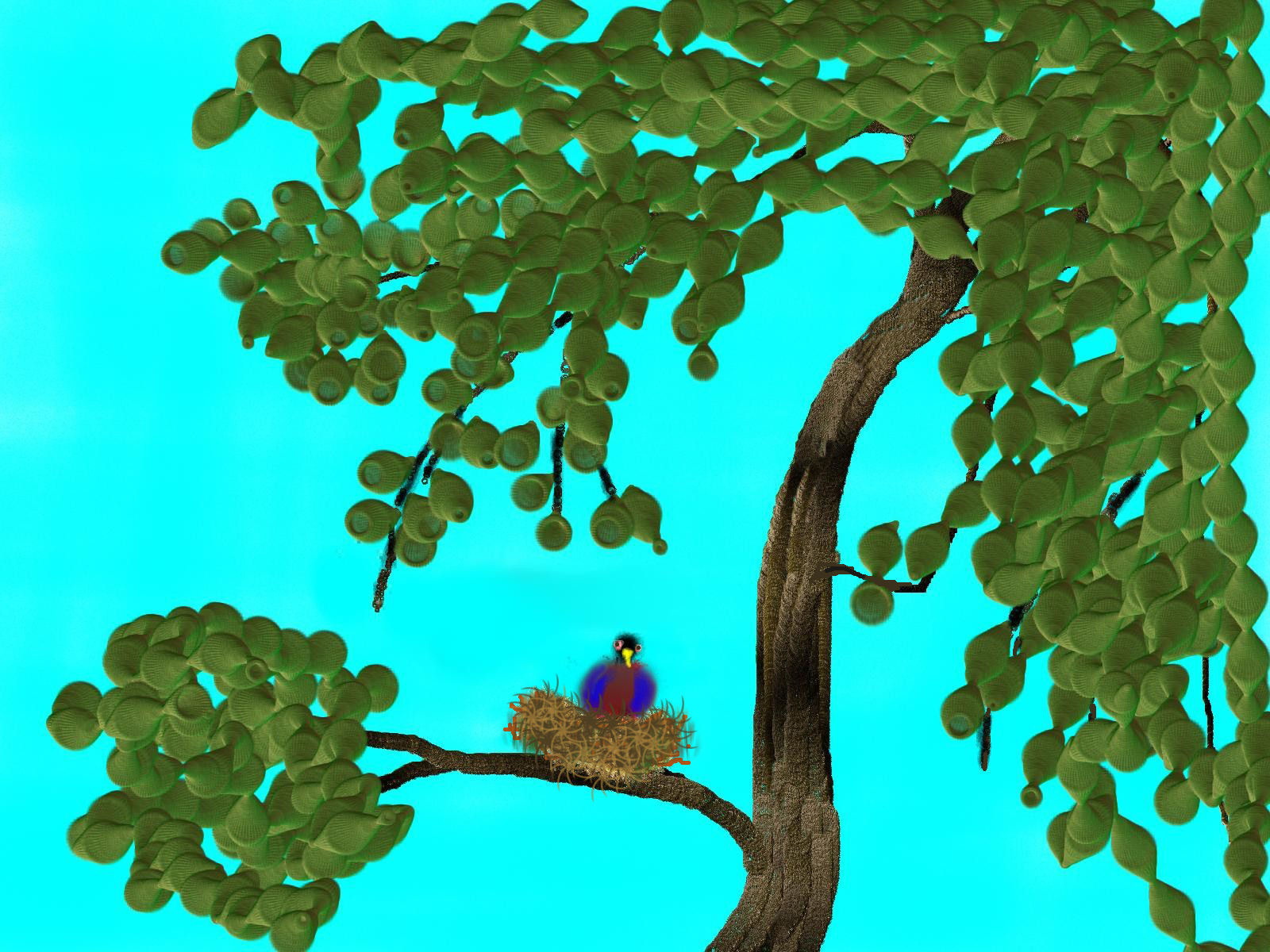 A little happy tree and a funny bird in a nest. Created with a free program called Twisted Brush. It is not true to life but art doesn't have to be true just expression.