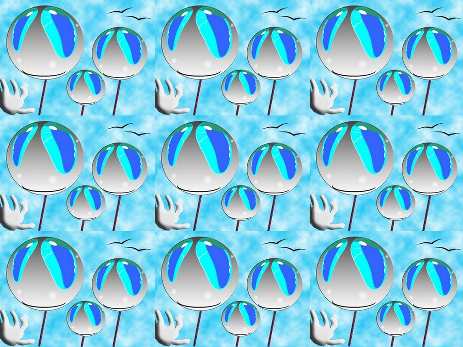 There are bunches and bunches of wierd smiling faces among the clouds. Are they balloons or are they lolipops? They are everywhere. :)