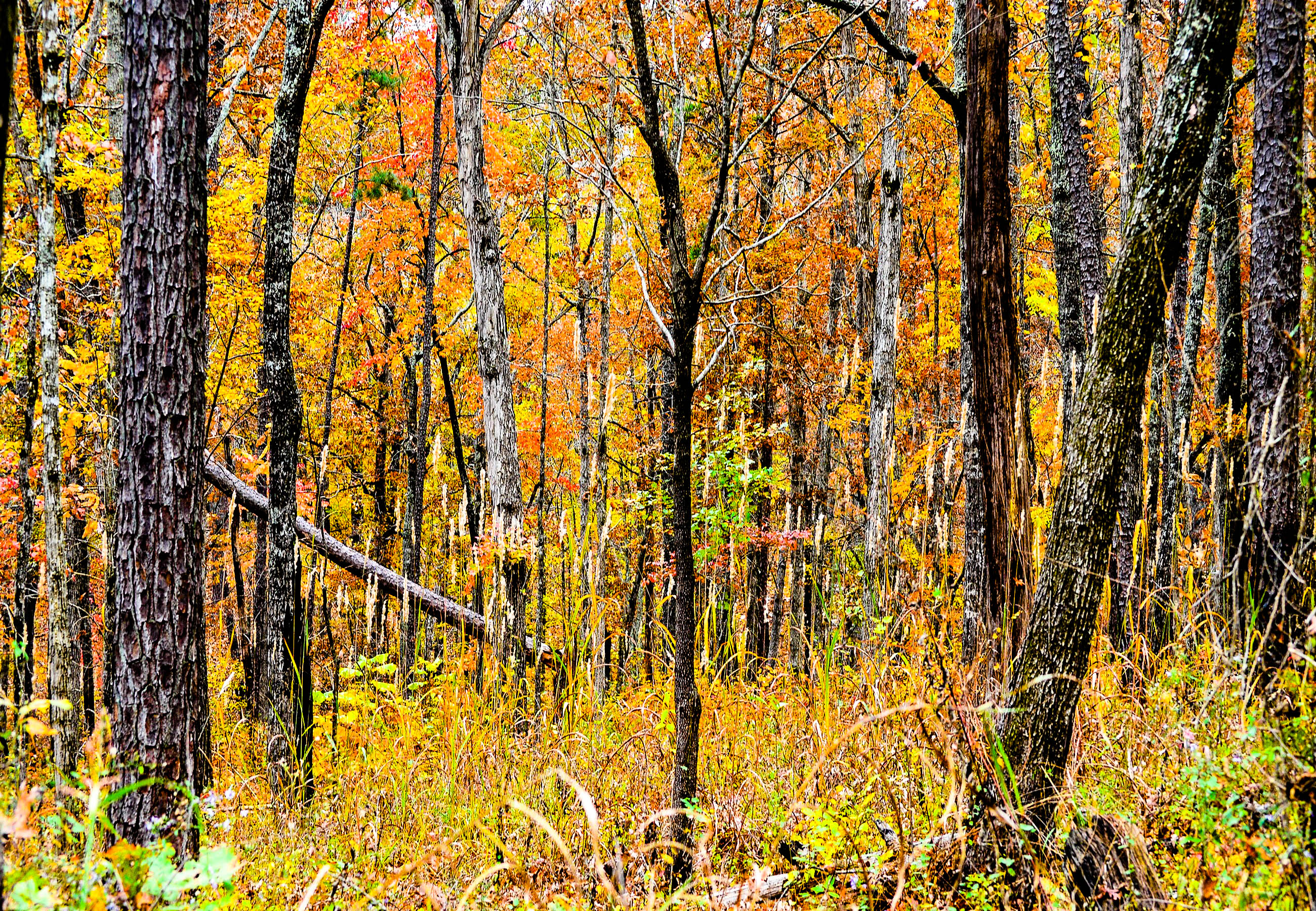 It's a forest. It's full of foresty things like weeds and grasses and colorful things. But a forest just seems to come alive in Autumn with all these yellows, browns, reds, greens, etc...you get the picture. It's an amazing time of year and lasts so briefly but if we hurry we can capture some of it forever. I present to you a small glimpse into this pocket of forest that will never be the same again. It will change constantly. Isn't that amazing? Now I can look back at this and remember with fond memories the journey my wife and I had into the woods looking at nature.