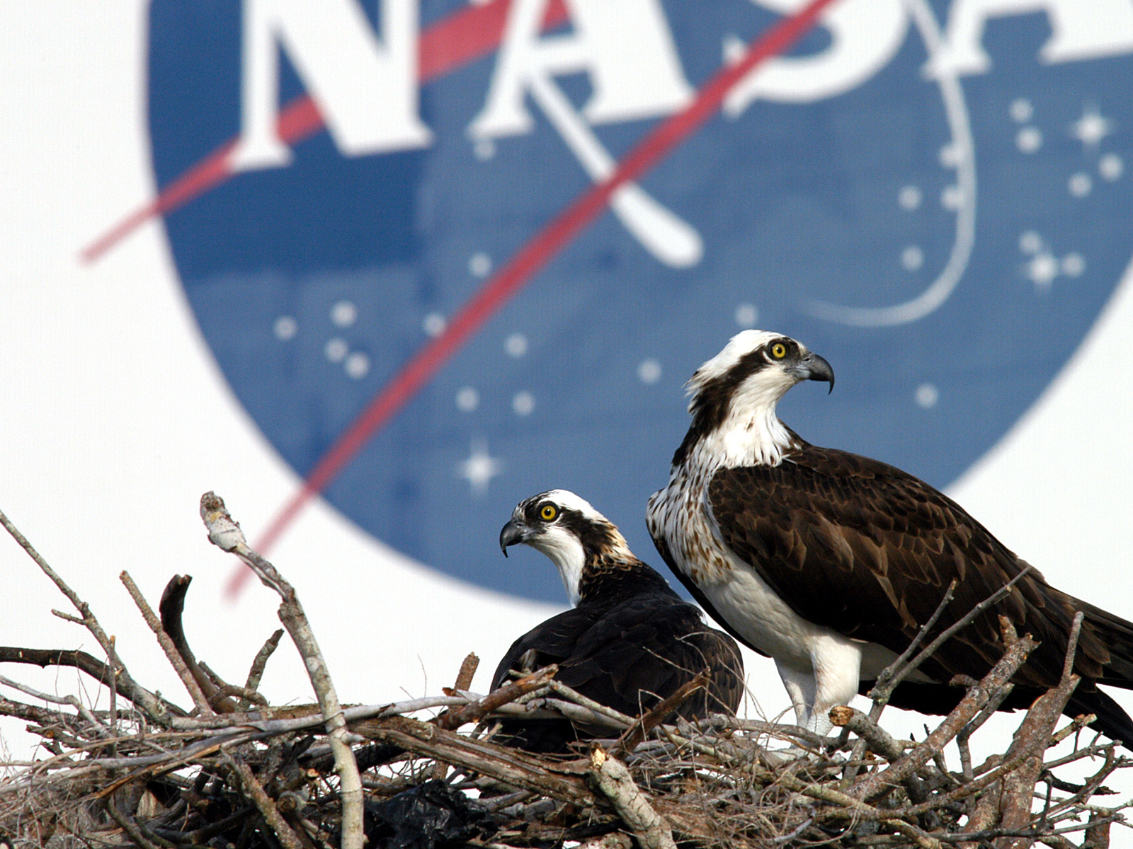 "A pair of breeding ospreys have taken up residence in a nest constructed on a speaker pole. Eggs have been sighted in the nest. The NASA logo in the background is painted on an outer wall of the 525-foot-tall Vehicle Assembly Building nearby. Known as a fish hawk, the osprey selects sites of opportunity in which to nest -- from trees and telephone poles to rocks or even flat ground." Credit: NASA. I just resized it, cropped it, and touched up some minor flaws.