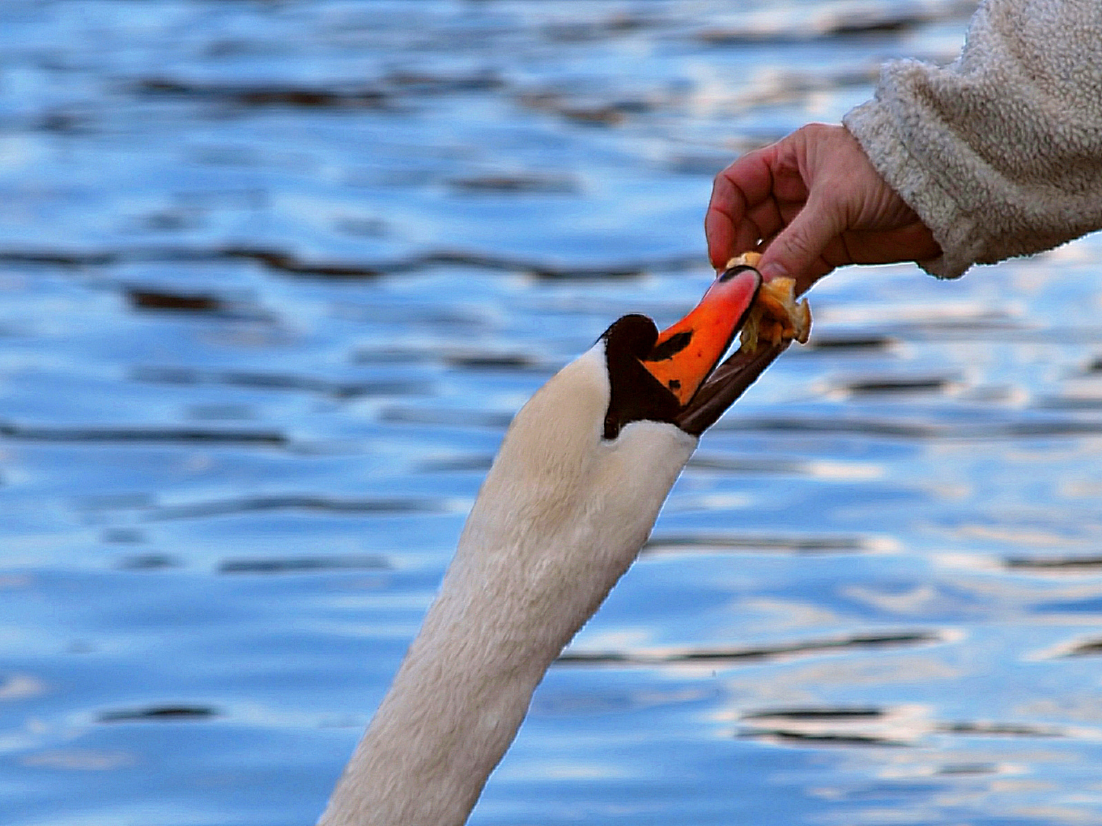 A lady feeding one of the Mute Swans on The Model Boating Lake on The New Brighton Promenade, near the mouth of The River Mersey.