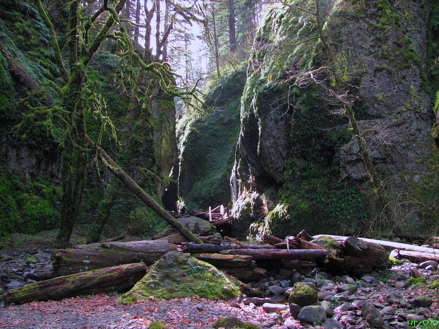 Taken in The Columbia River Gorge Scenic Bi-way. This little creek has over the years cut through the hard basalt rock on its way to the river. If you like ferns this is the place for you! Tried to get up closer for a better view of the inside of the gorge but there is a log jam with very green slick wood. If you fell between and into the ten foot deep water your in a lot of trouble! So you have to enjoy it from here I'm afraid. Hope you like!