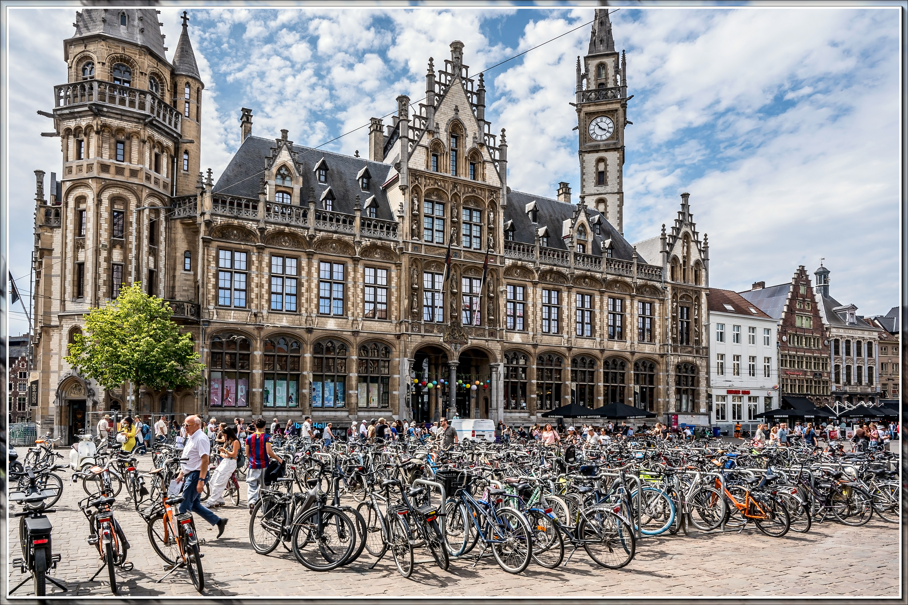 This photograph is taken on the Korenmarkt Square in the historic center of Ghent, Belgium.