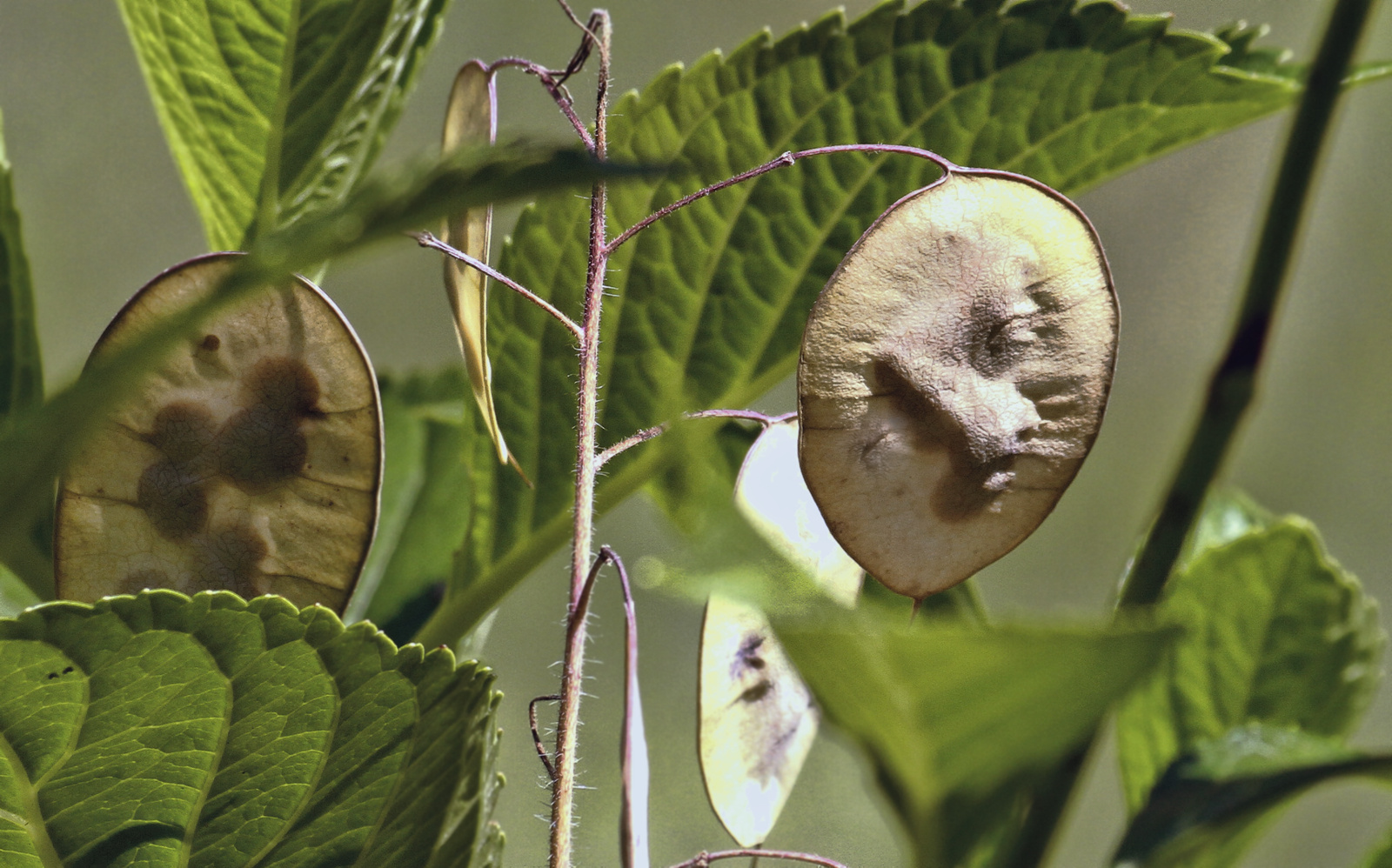 I was sitting on my front porch rocker, camera in hand, waiting for hummers or butterflies when looking through the rails of the logs connecting the pillars that support the porch roof, I spied a pod of a money plant (lunaria). It looked rather like a human face. I tore off a couple of branches of the hydrangea it is keeping company with and took some shots of it. See what you think.