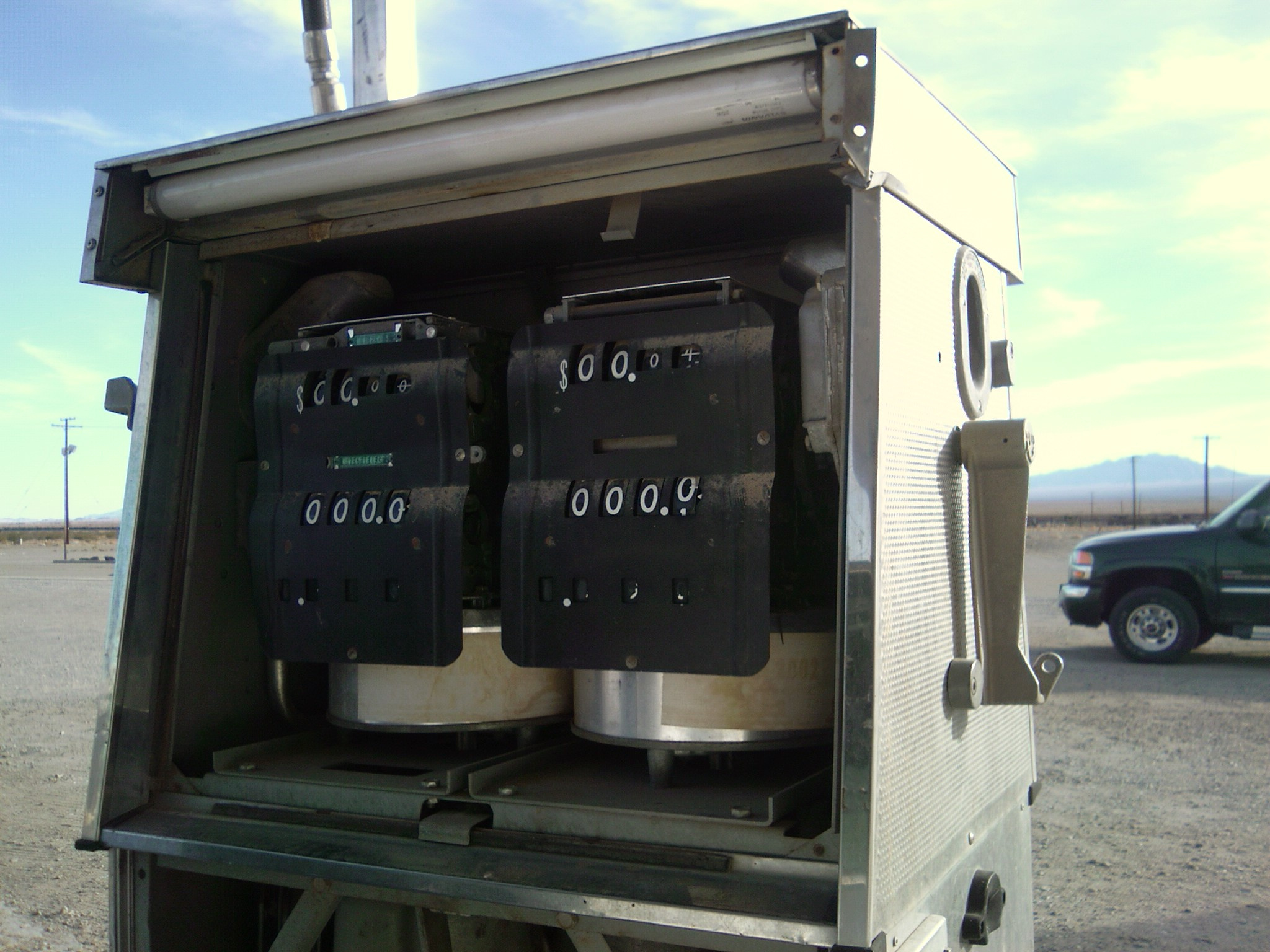 This is a picture of an old gas pump at Roy's Cafe in Amboy California. Amboy is now a ghost town on the old route 66. When we got there, there was only one person and her dog living in the town. We were out of gas and unfortunately there was no gas in this tank. Enjoy!