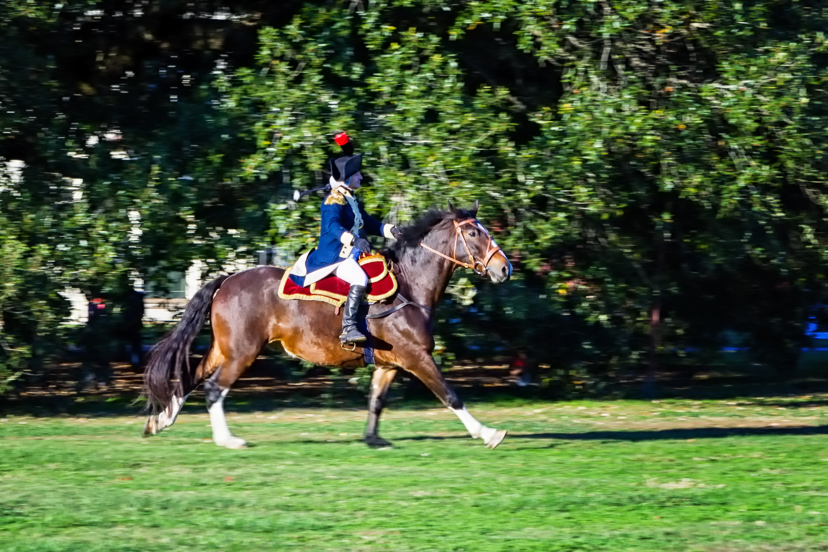 Williamsburg, Virginia, USA. The Marquis riding around the Market Square grounds.