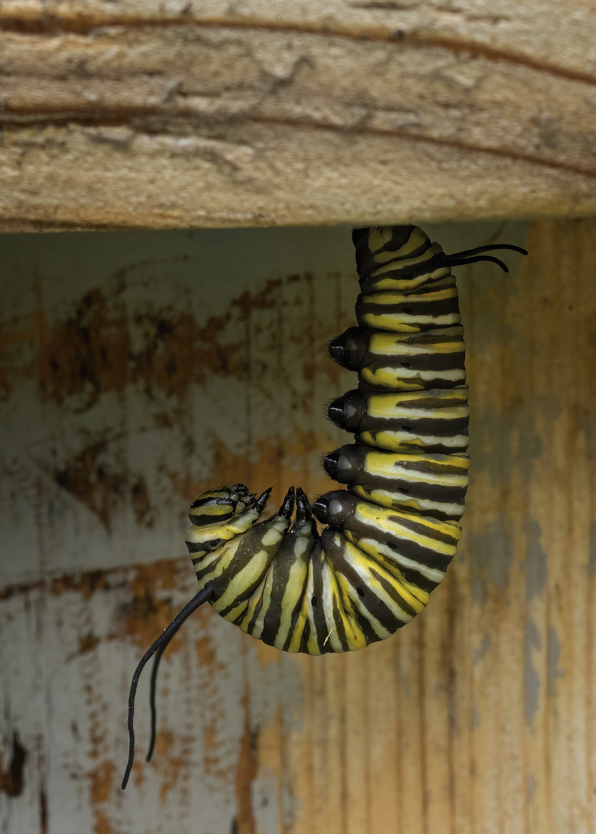 Monarch caterpillars are not known for being talkative creatures. This one was especially quiet. A day earlier, it looked like Fat Albert, voraciously noshing on milkweed leaves. Crawling ten feet away from the plants, the caterpillar attached itself to the underside of a fence rail. All it would tell me is its name, 'J', giving me a look of distain as to how I would even have to ask. Male or female? No answer. 'Jack or Jill'? No response. Apparently, just 'J'. By the next morning, Jay had shed its final layer of skin to form its chrysalis to start the metamorphosis. 100mm macro lens used.