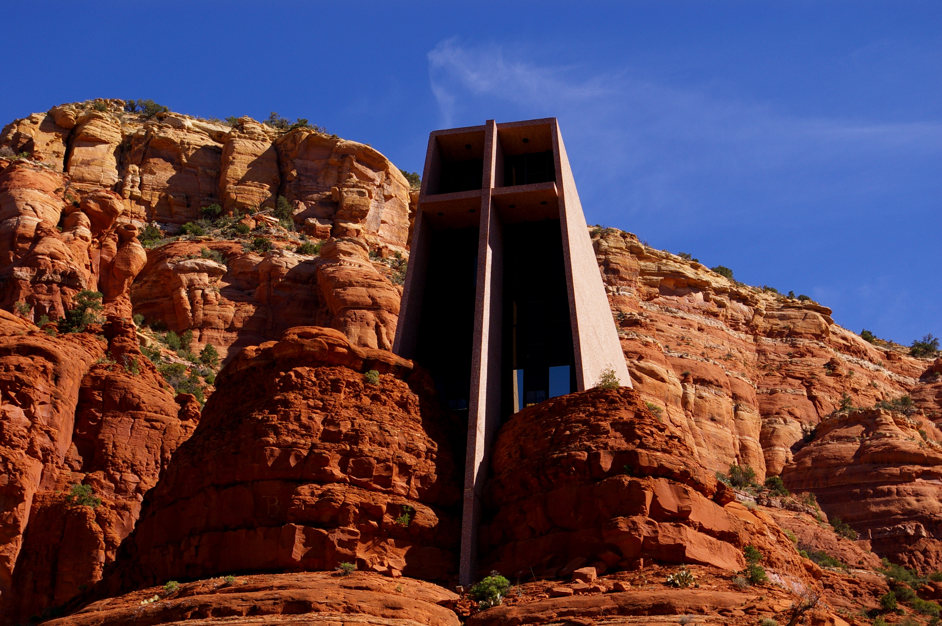 This is the Chapel of the Holy Cross, in Sedona, Arizona. It was built right in between two of the red rocks. Frank Lloyd Wright helped to see this chapel built. Once inside visitors can look through the 90 foot glass windows at the valley beyond, seeing a beautiful view of more red rocks. Even those that come with no religious affiliation or spiritual connection, find the greatest sense of peace and wonder. I just loved it here. I am back from my vacation and I took over 1000 photos, this is the first of many. I would like to hear any comments you might have.