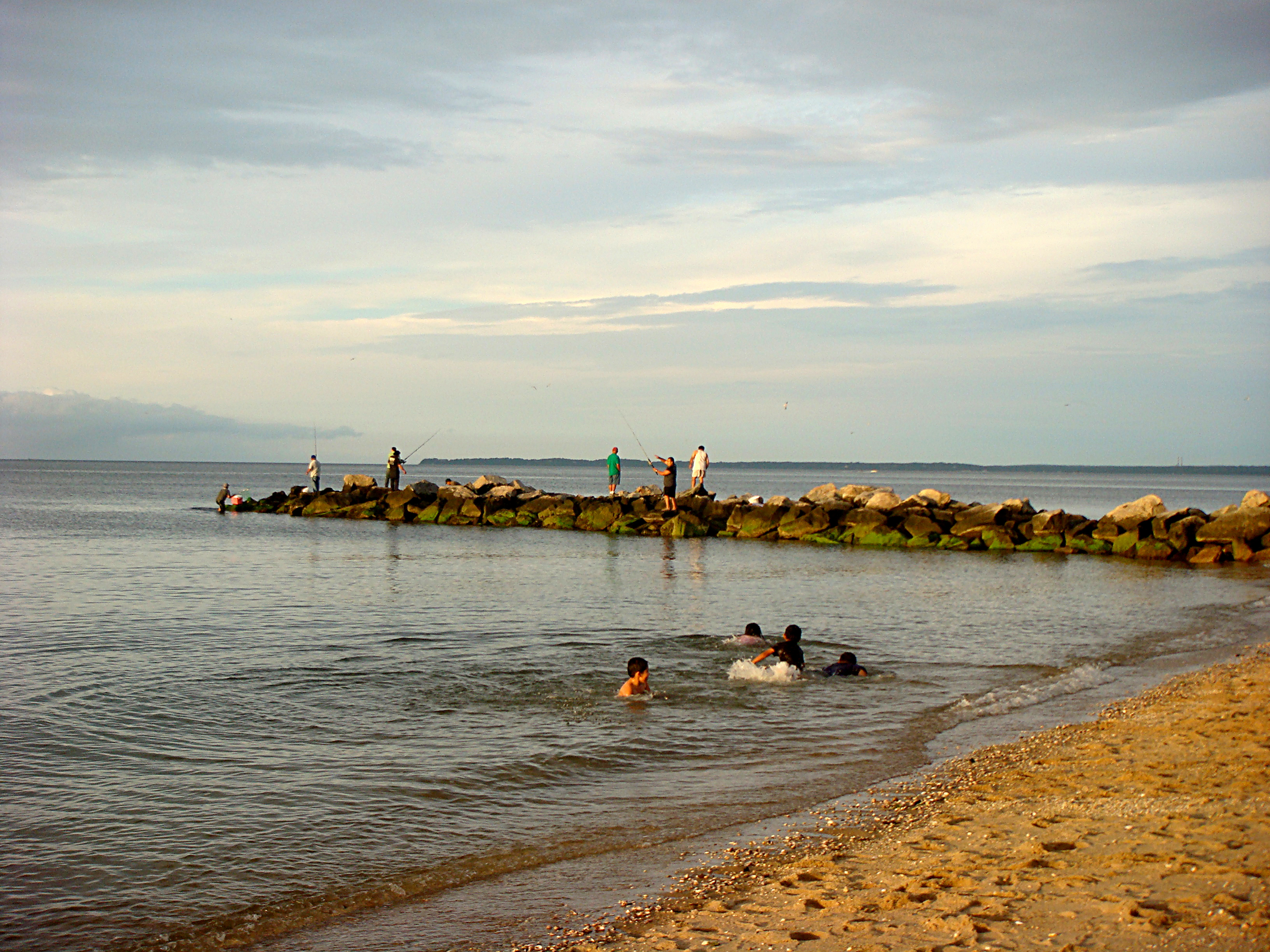 The children play in the water having a great time, while there fathers, are on the jetty fishing, ether for dinner or for extra money. If you open this photo up, you can see that it is low tide by the water line on the jetty. I'm sure these children will always have great memories of days like this one. I know I had a smile on my face.