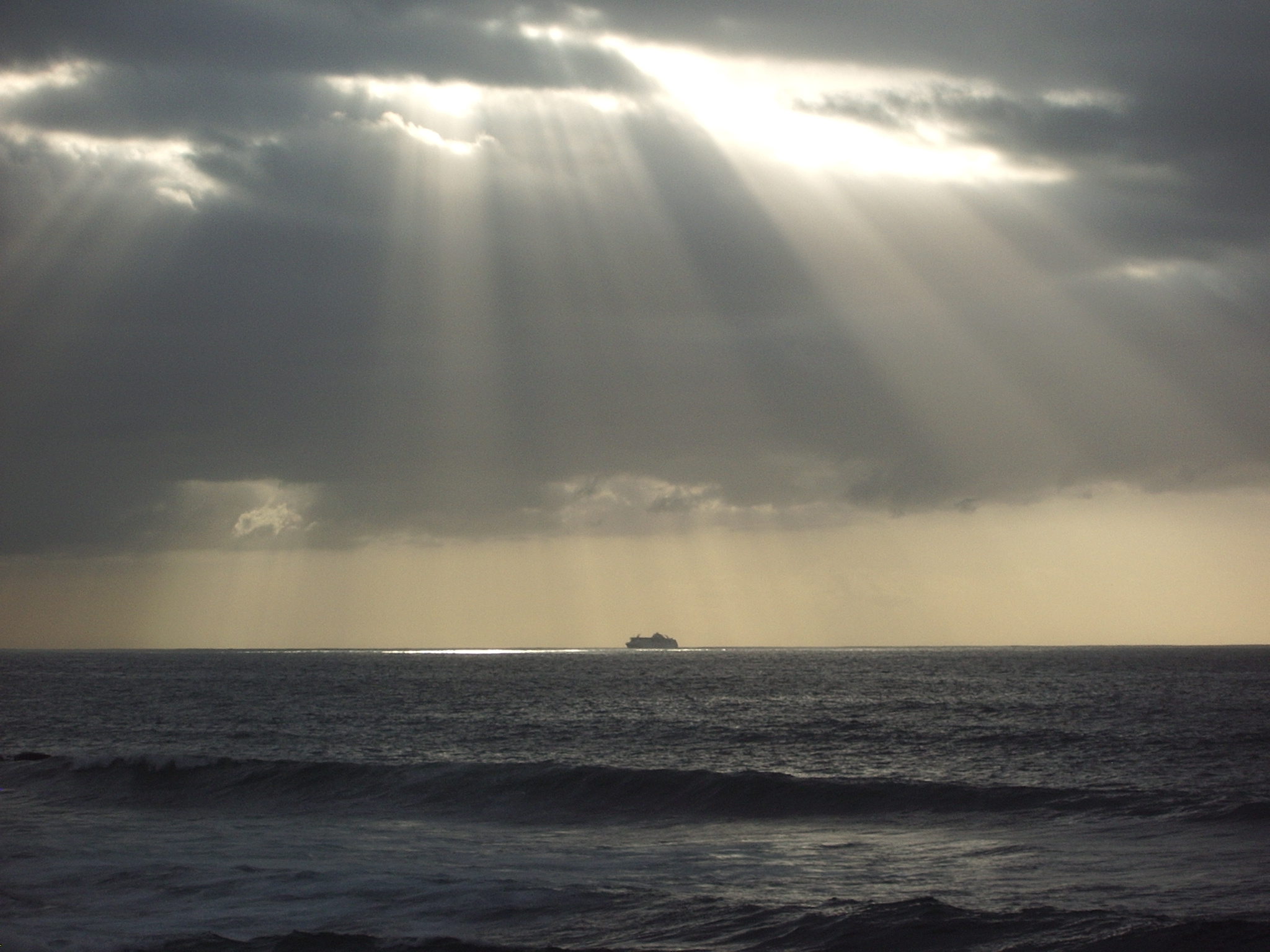 Taken just as the cloud cover broke to allow sunbeams to penetrate the cloud cover, the sky on the horizon seems to have a yellow tint for some reason.