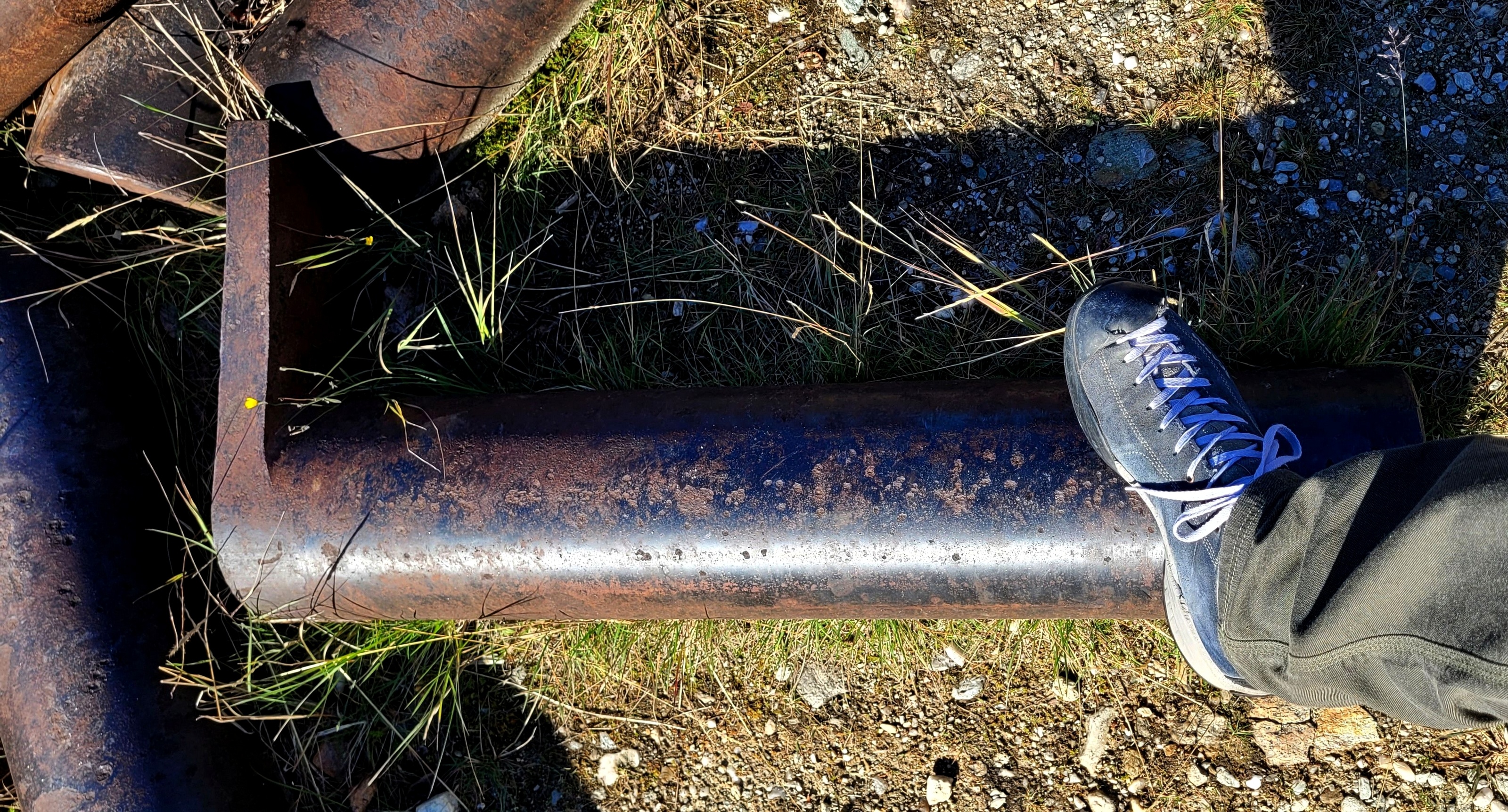you can see the size of my shoe, imagine how heavy that bolt is, they used it to fix the buckets into each other so they could be used like a conveyor ....