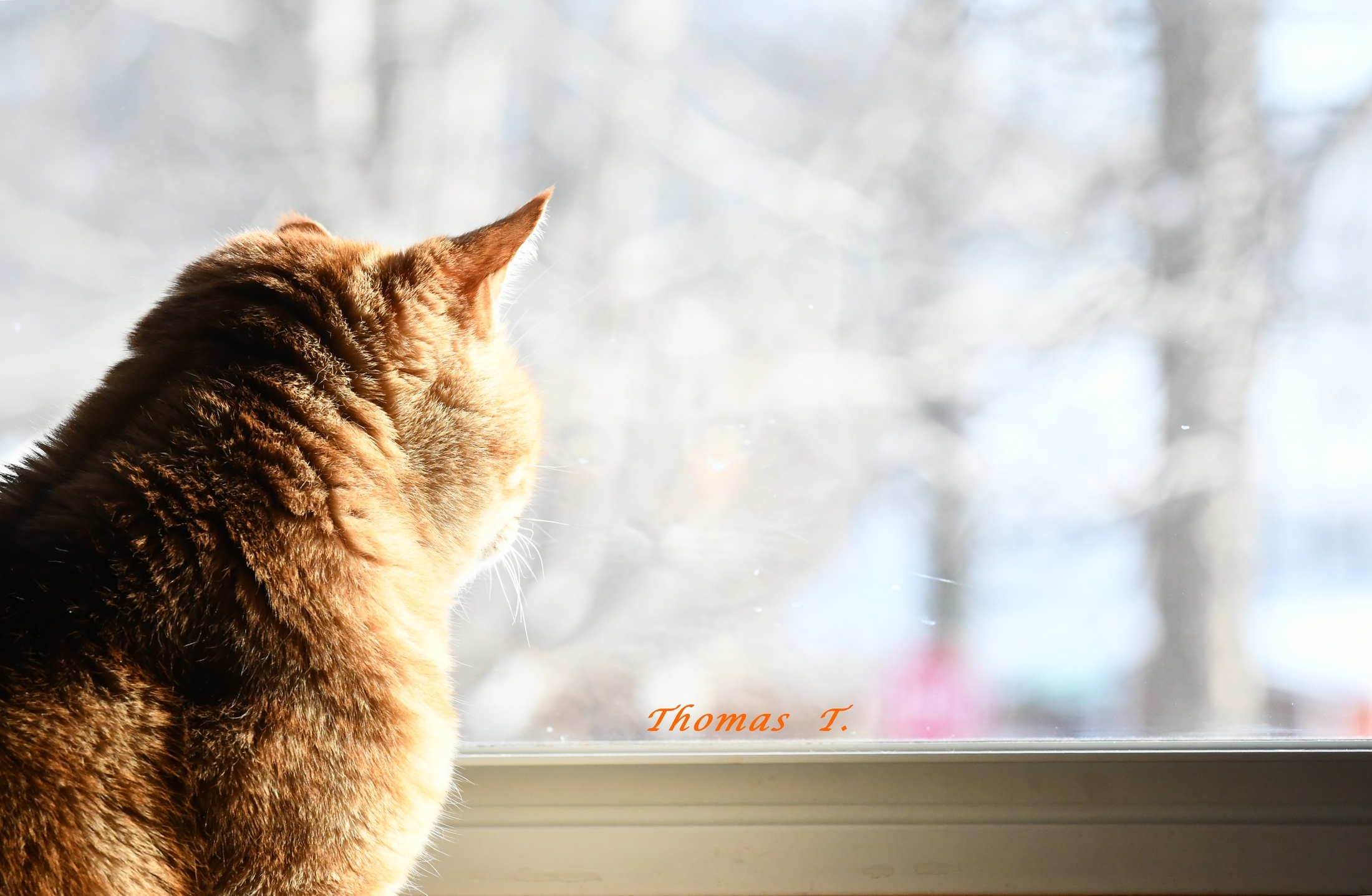 Mr. Thomas watching it snow. I sure miss him it will be a year in May since his passing. I have had many cats over my 75 years, and he truly was the most unique and awesome cat boy. Thanks for your comments. tigs=^..^=
