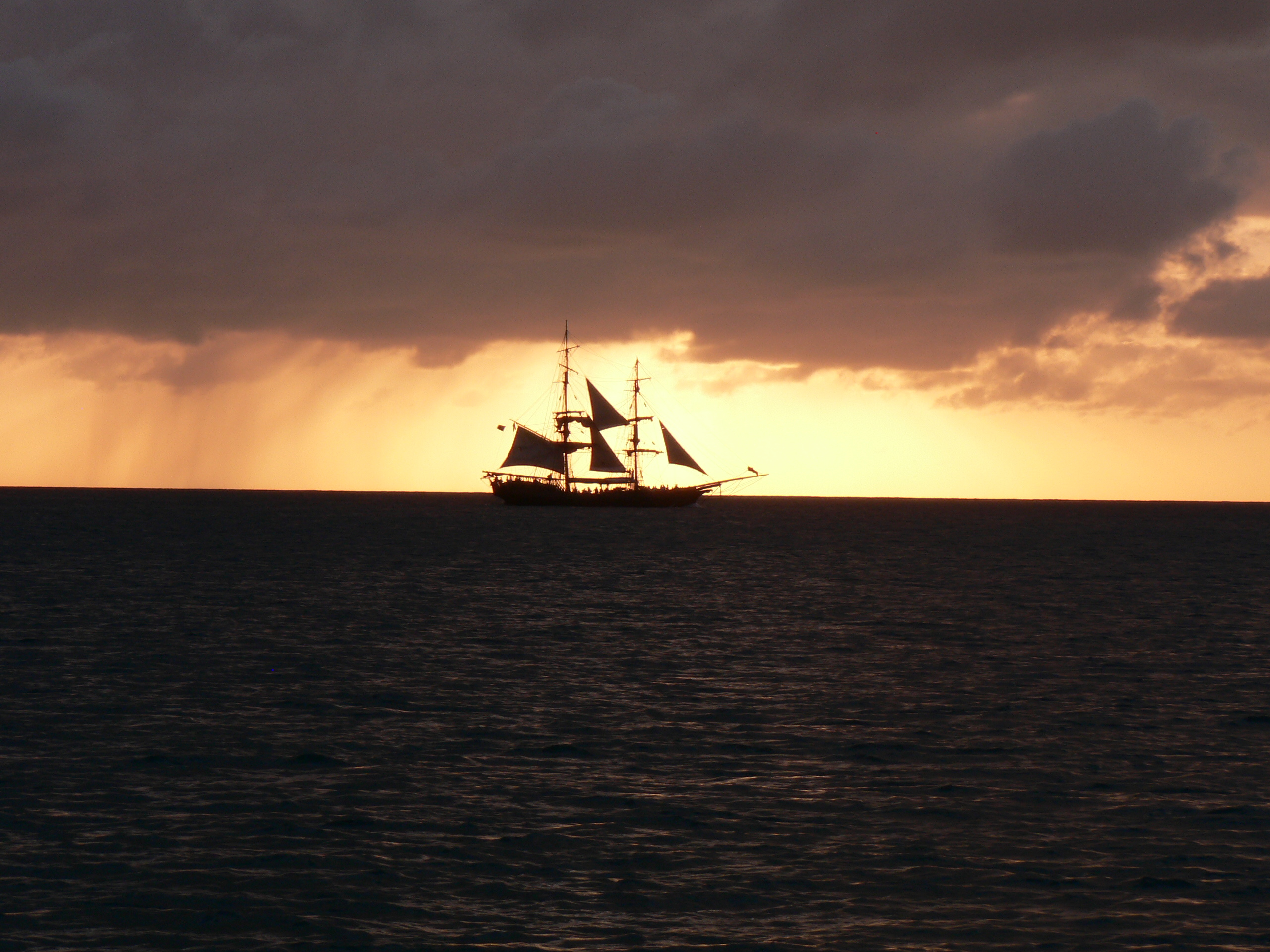 While staying in Rodney Bay in St. Lucia, the Unicorn (known as the Black Pearl in the Pirates movies) presented itself in a great position with a far rain squall and orange sky.