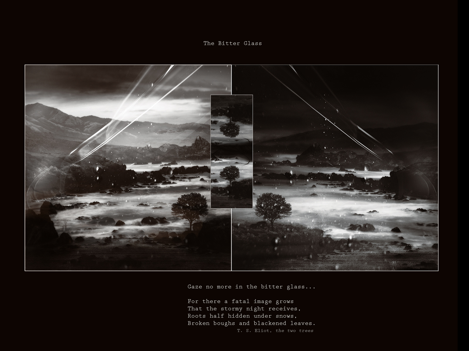 used Pierre image (I have an obsession with lonely tree), as well as another free 'landscape' image (mountains and shore) coming from Ingram, plus two others (for the glass and snow efffect) coming from Stock.XCHNG. added to that there's still another sky shot I took myself and a old render made with 3ds max.... blended everything together and here's the result^^. hope you like. program used: photoshop cs________ EDIT : ...um I just realised something. I made a mistake with the author of this poem... it's not T.S elliot but William Butler Yeats who wrote the 'two trees'... er sorry for that