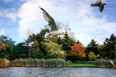Some of those seagulls that like to hang out in public places in the hopes of receiving handouts from random strangers who happen to find themselves in the vicinity while holding anything remotely edible. And woe-betide anyone that holds out on not sharing less than the seagull's fair share; which is usually estimated to be somewhere in the neighbourhood of 90% of the take.